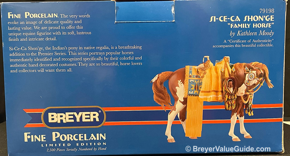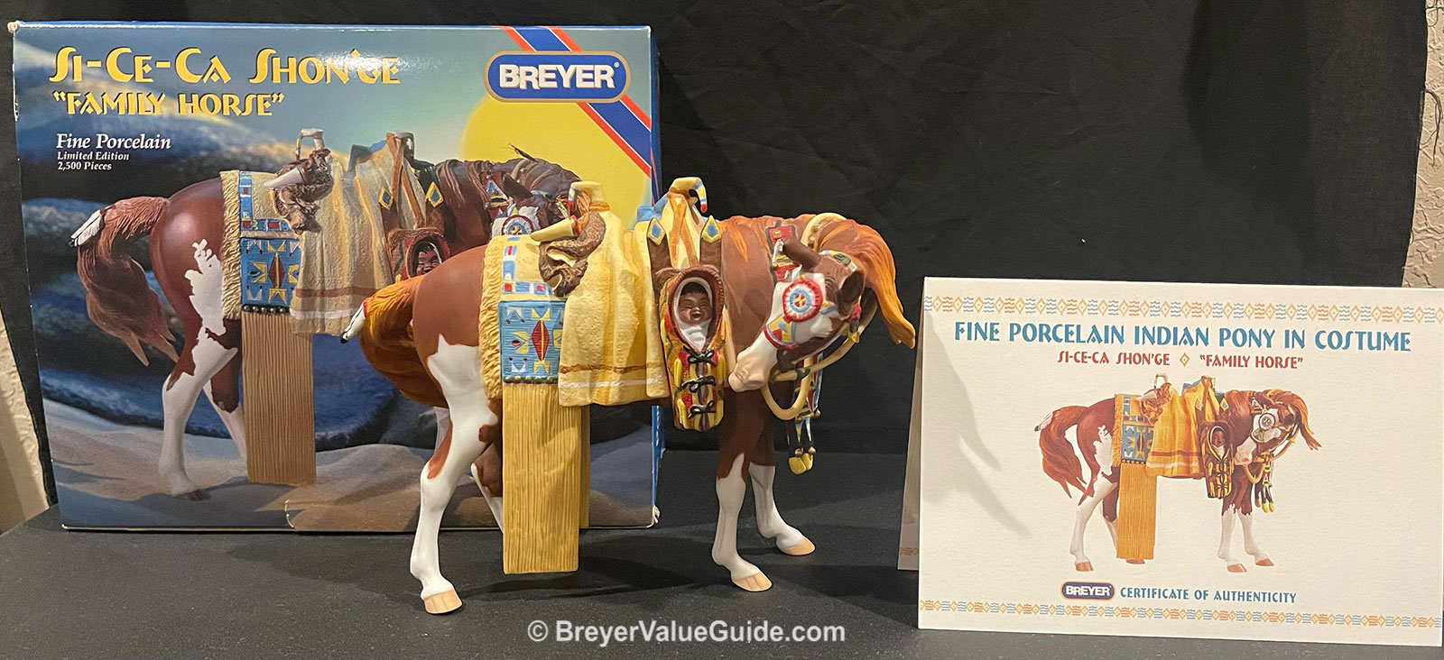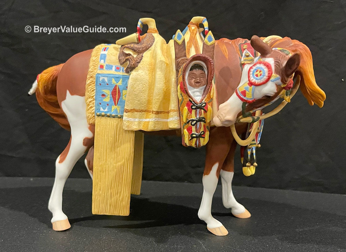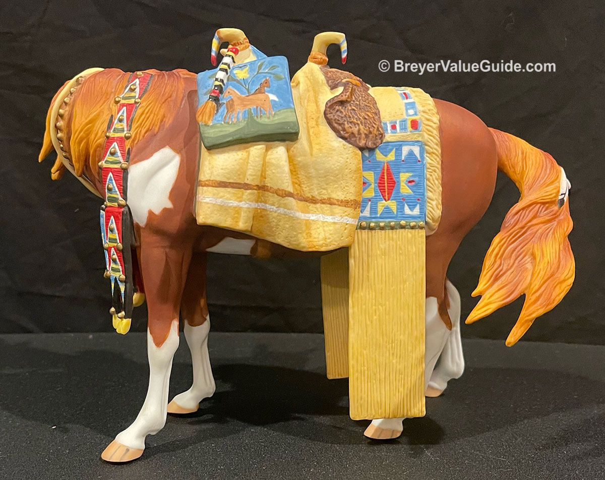 Porcelain; matte chestnut pinto; bald face; 4 stockings; Native American regalia; with COA, 1/2500