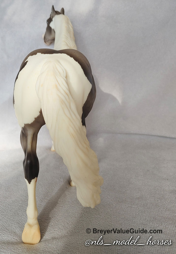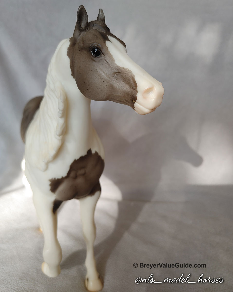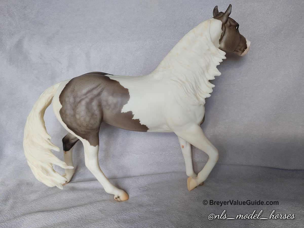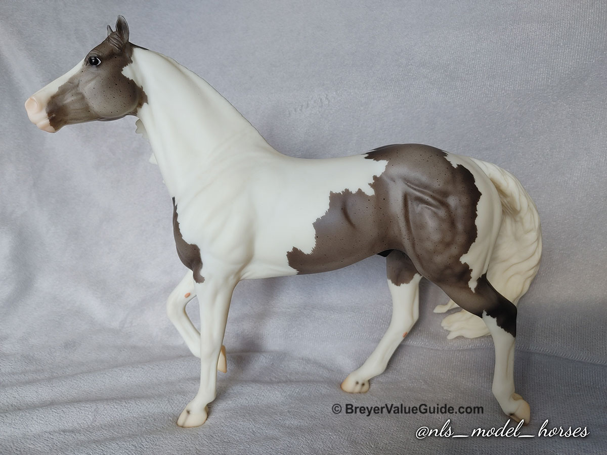 Matte grey pinto; dapples; wide blaze; white mane and tail; 4 high stockings
