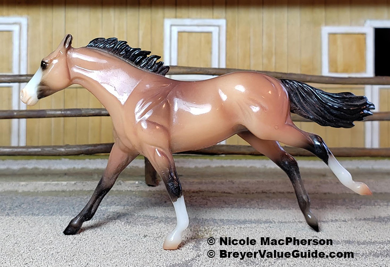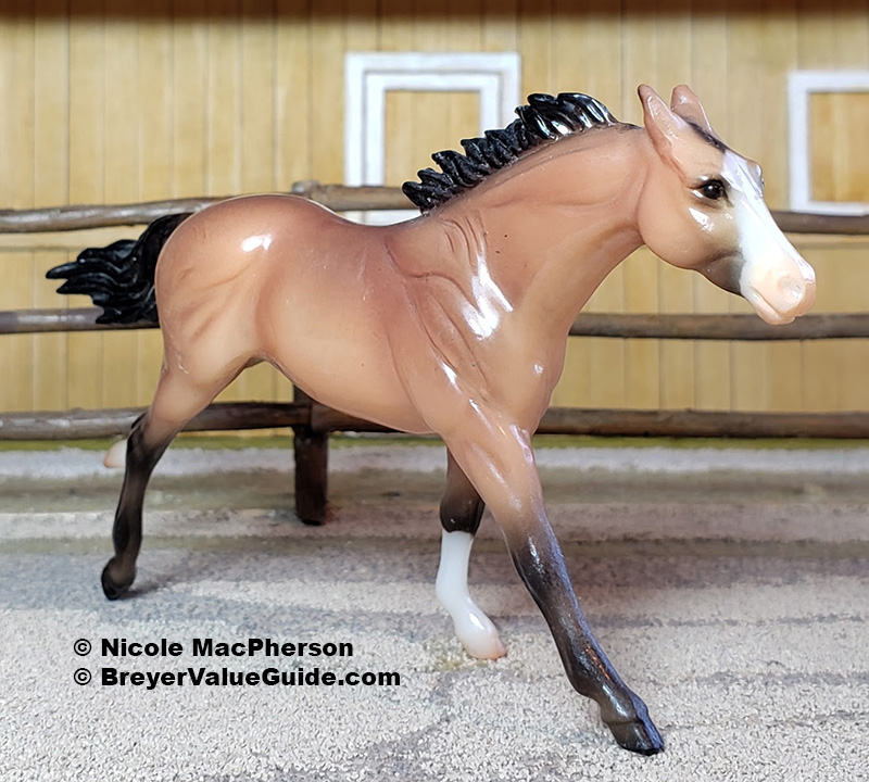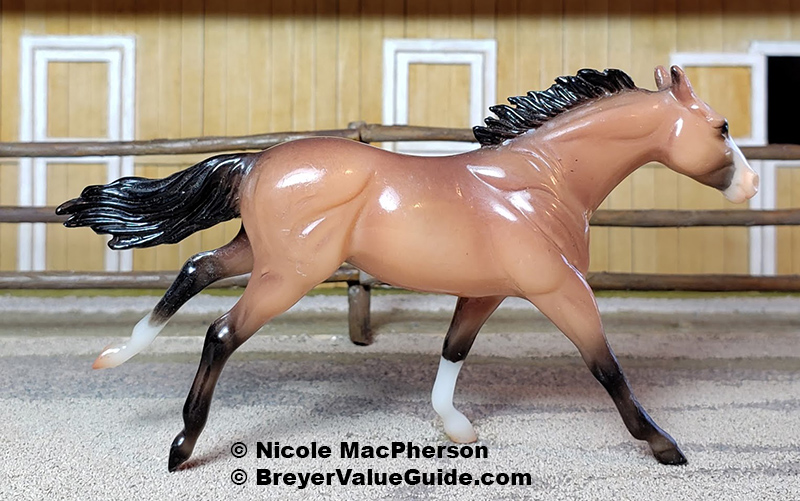 Glossy light bay; black points; stenciled bald face; 2 socks; QVC SR