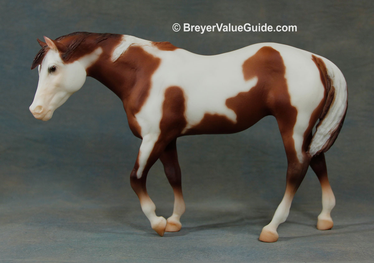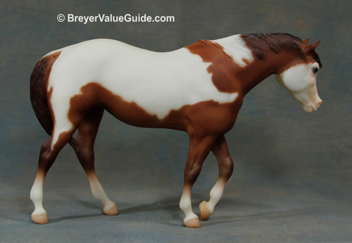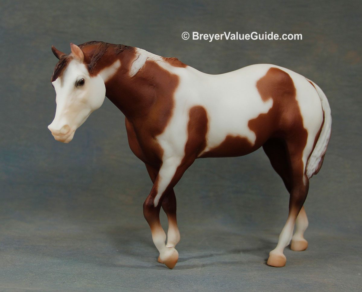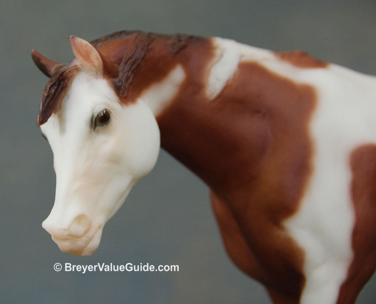 Matte chestnut pinto; stenciled bald face; 4 socks; some models have brown irises (“bi-eye”) Tour SR