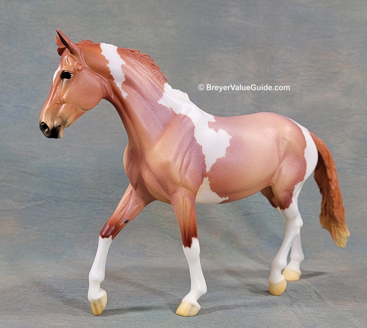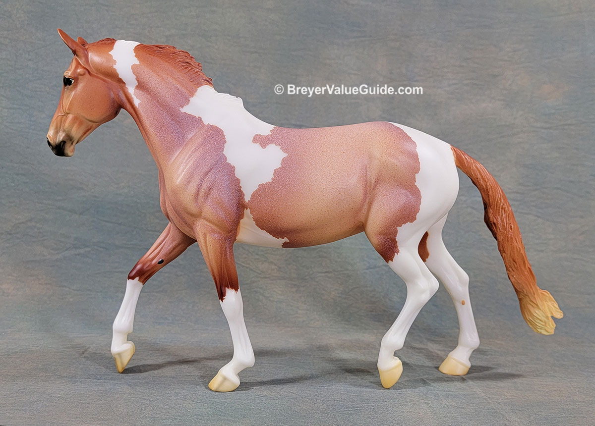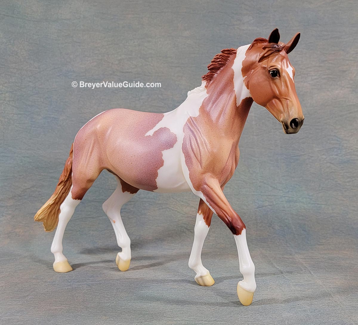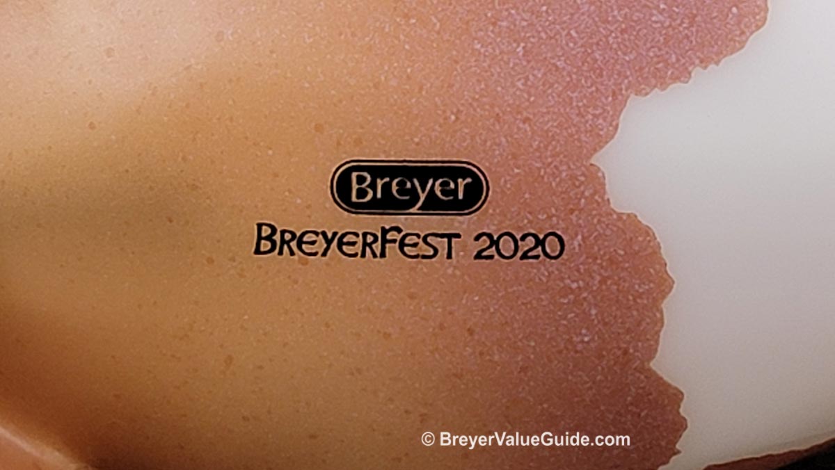 Matte red roan pinto; star; 4 stockings; striped hooves; “BreyerFest 2020” stamped on belly; BreyerFest SR; 1/800