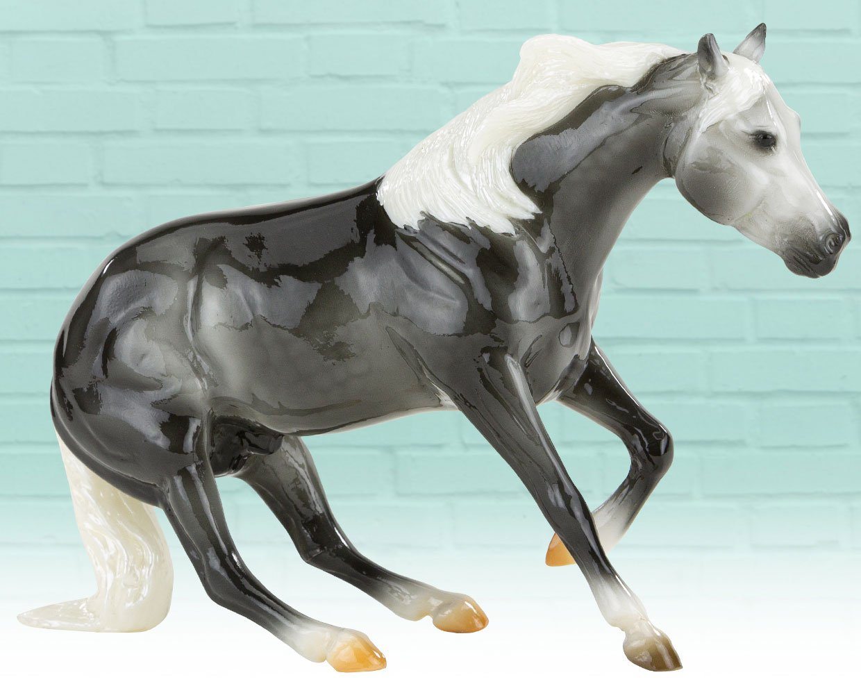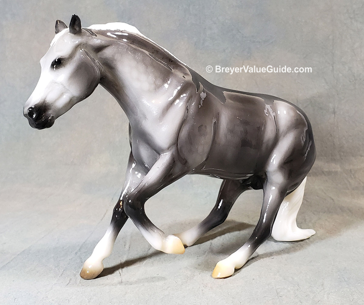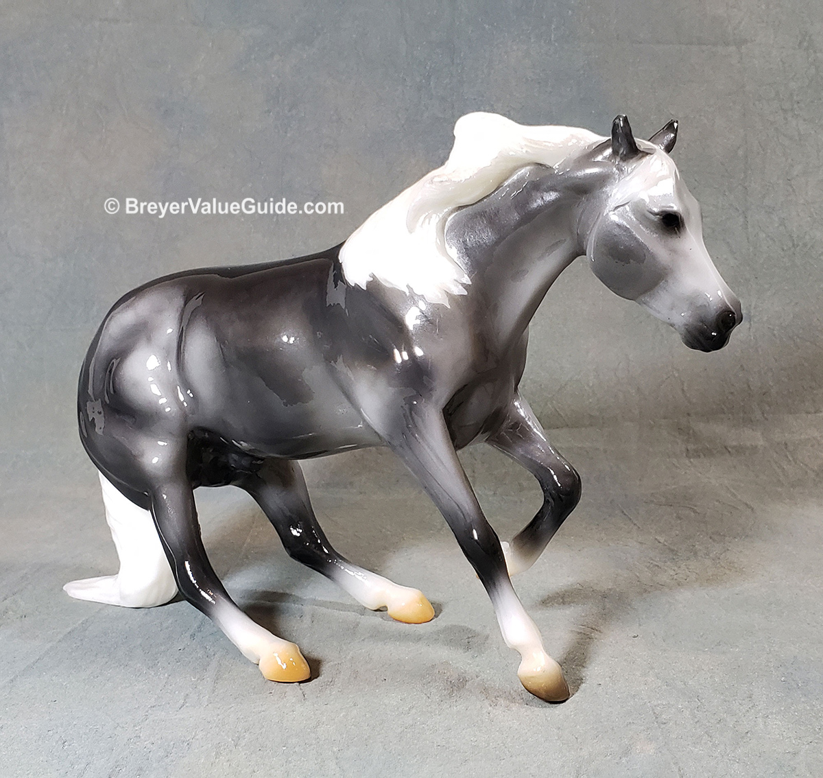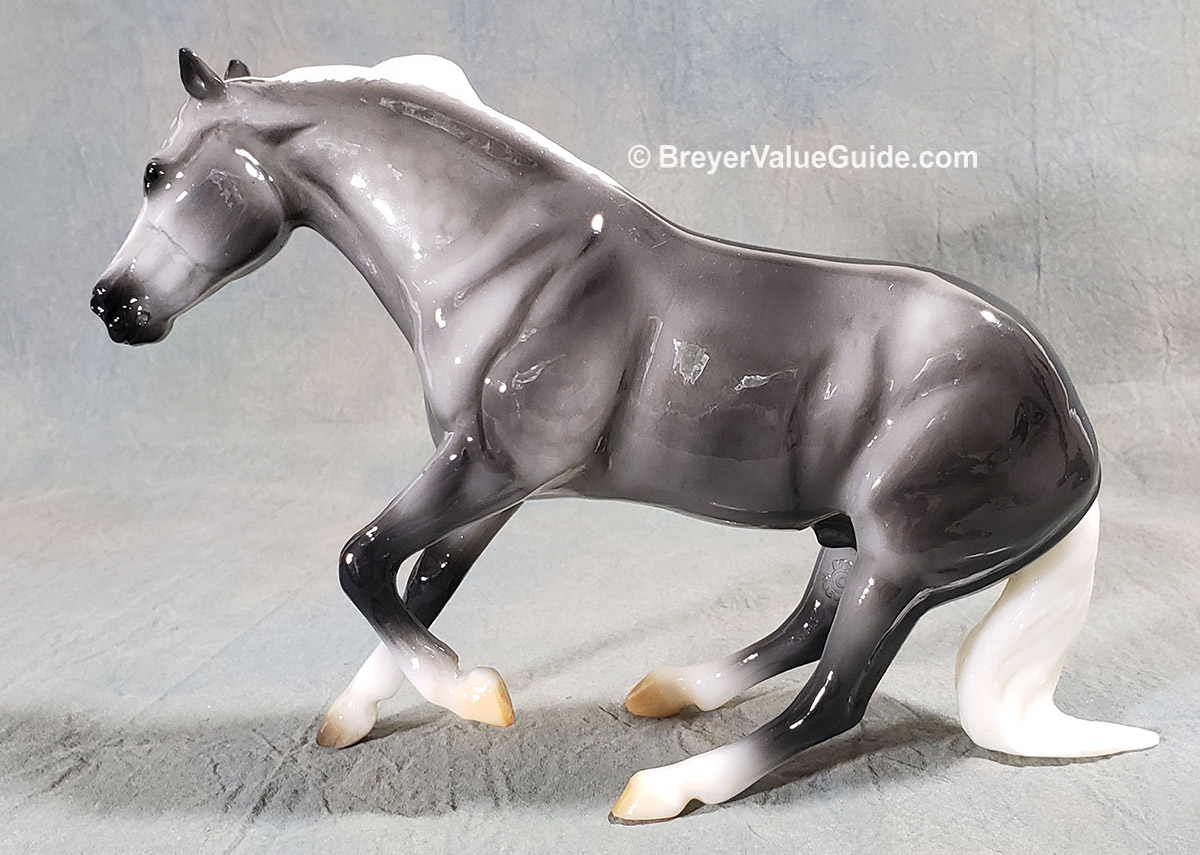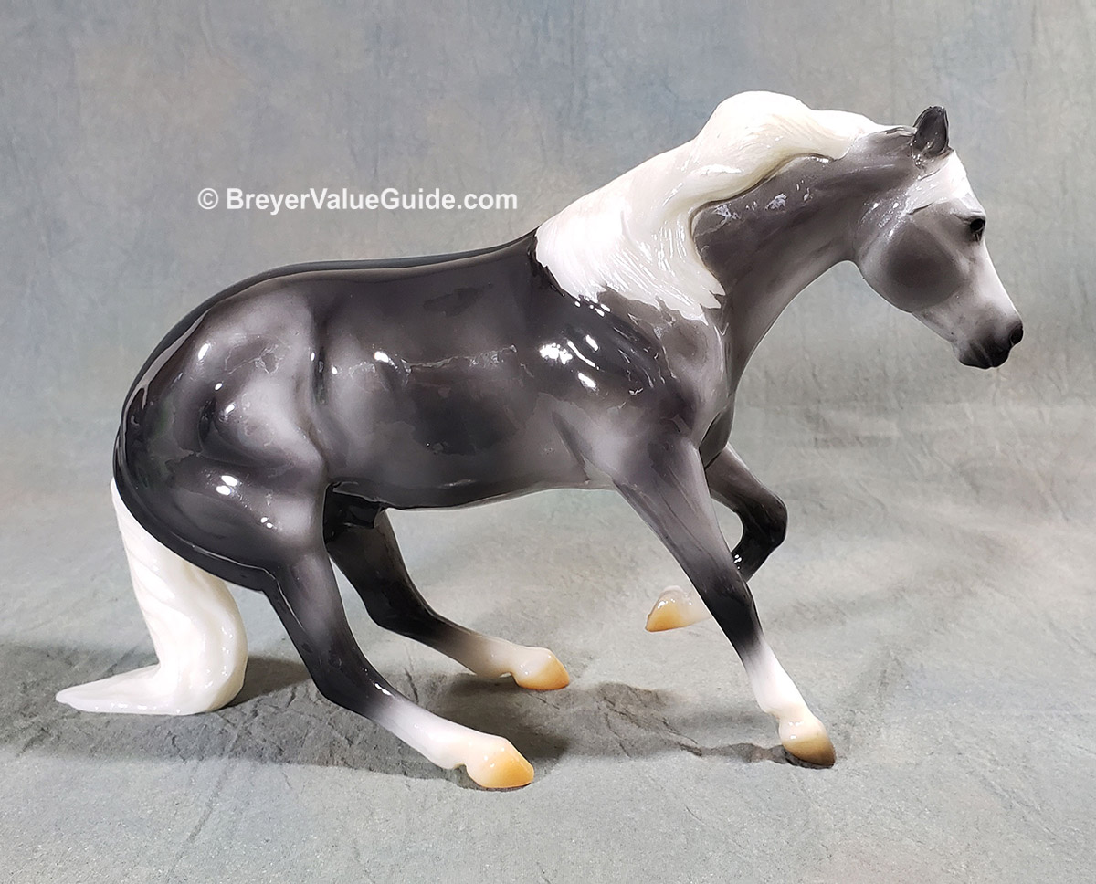 Glossy shaded dark dapple grey; pearly mane and tail; 4 socks with one grey hoof; Collector Club Gamblers Choice SR