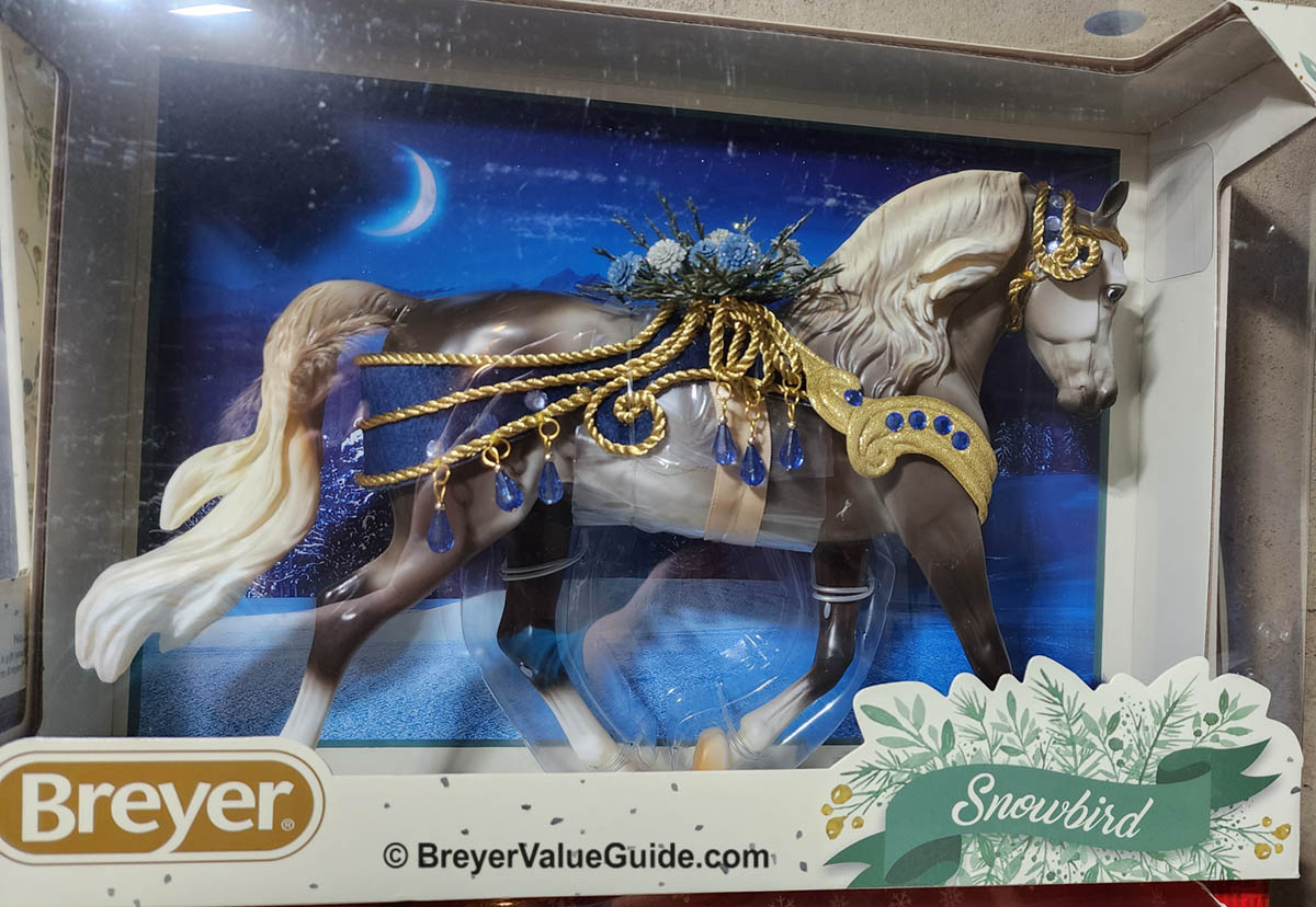 Pearly shaded grey, 4 socks, blue and gold costume, “Happy Holidays 2022” belly stamp, 2022 Holiday Horse SR Issue price: $65