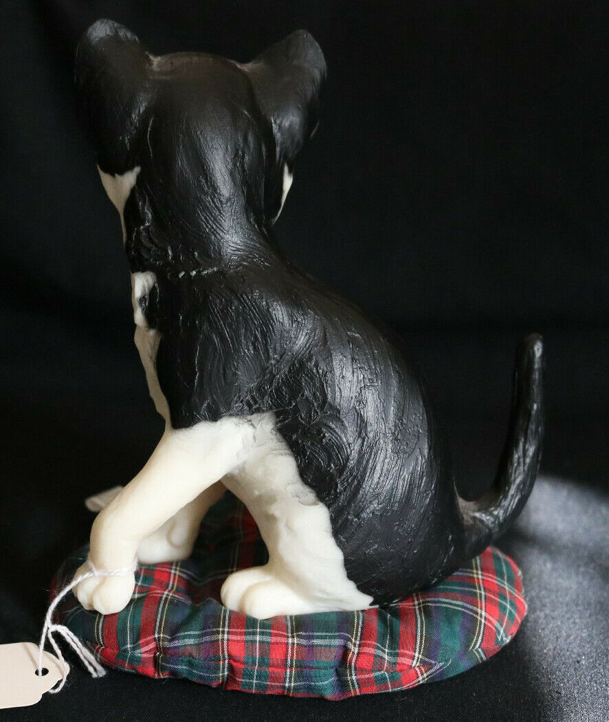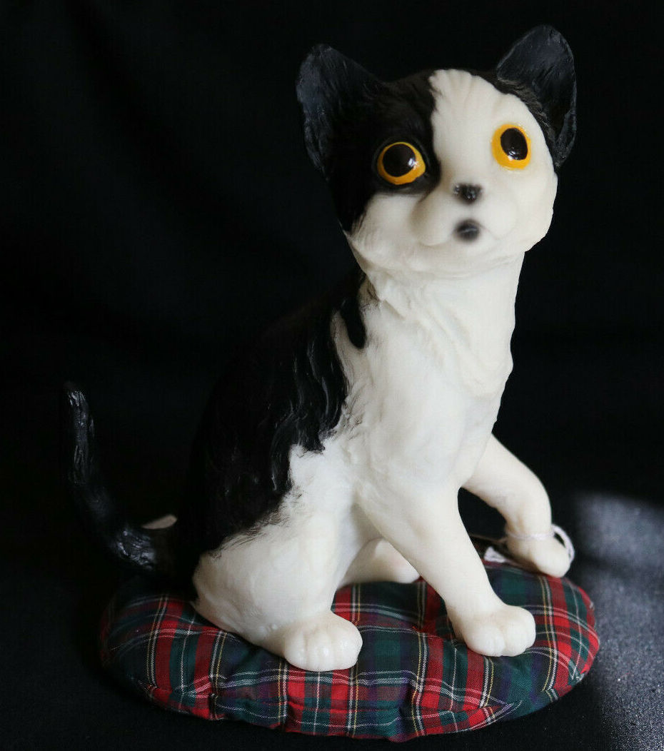 Matte to semigloss black and white; gold eyes; grey nose; plaid cushion