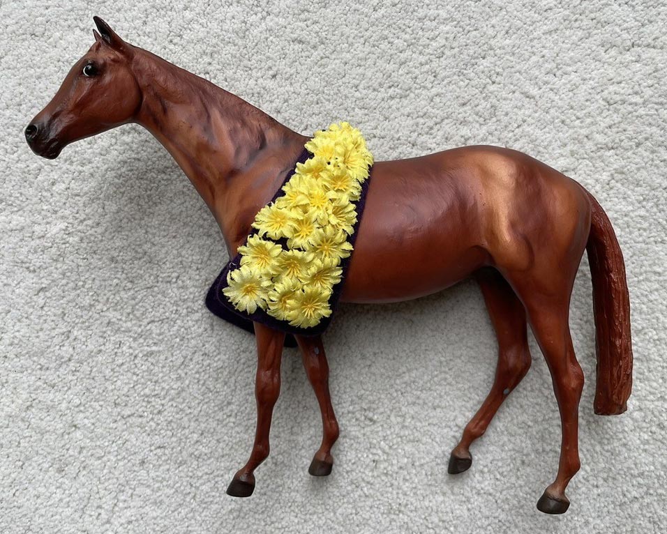 Matte shaded chestnut; tiny star; eye whites; included yellow flower blanket