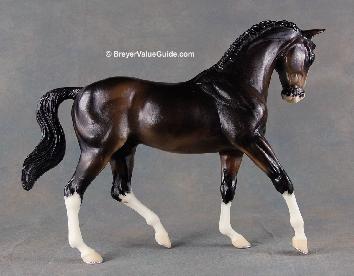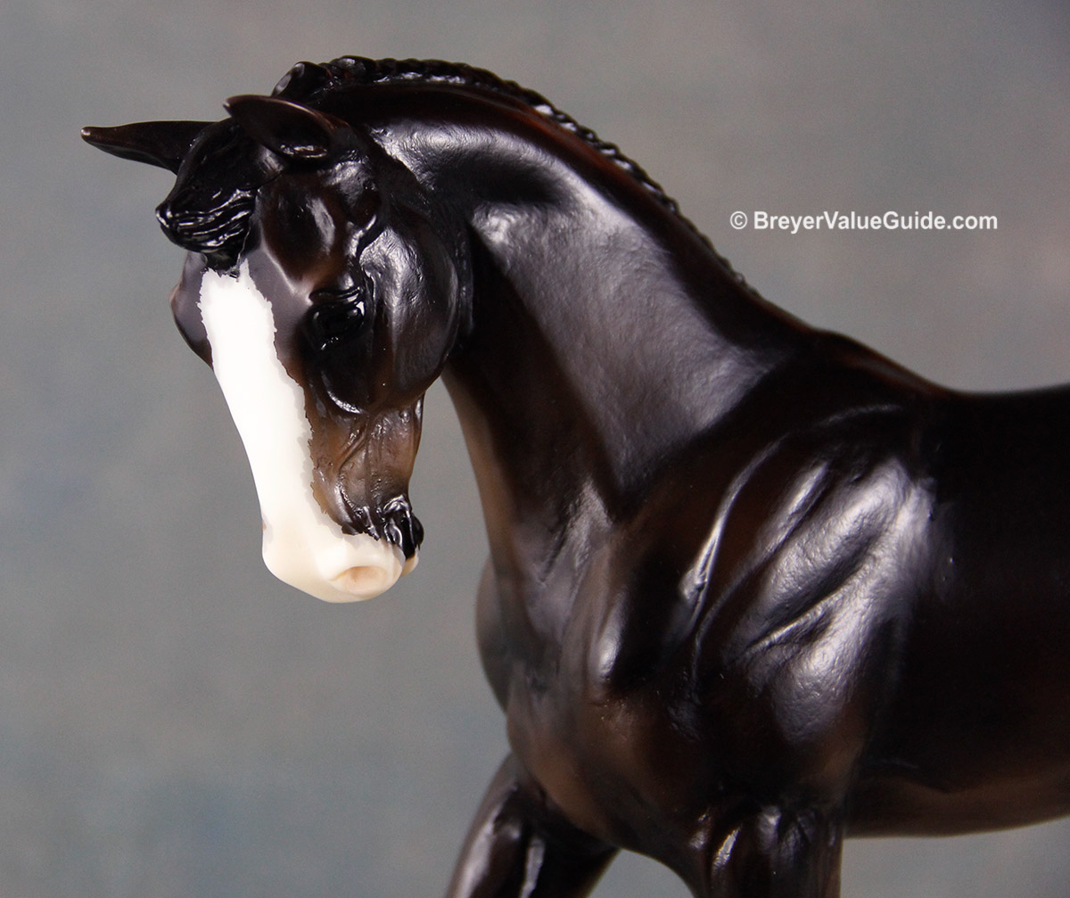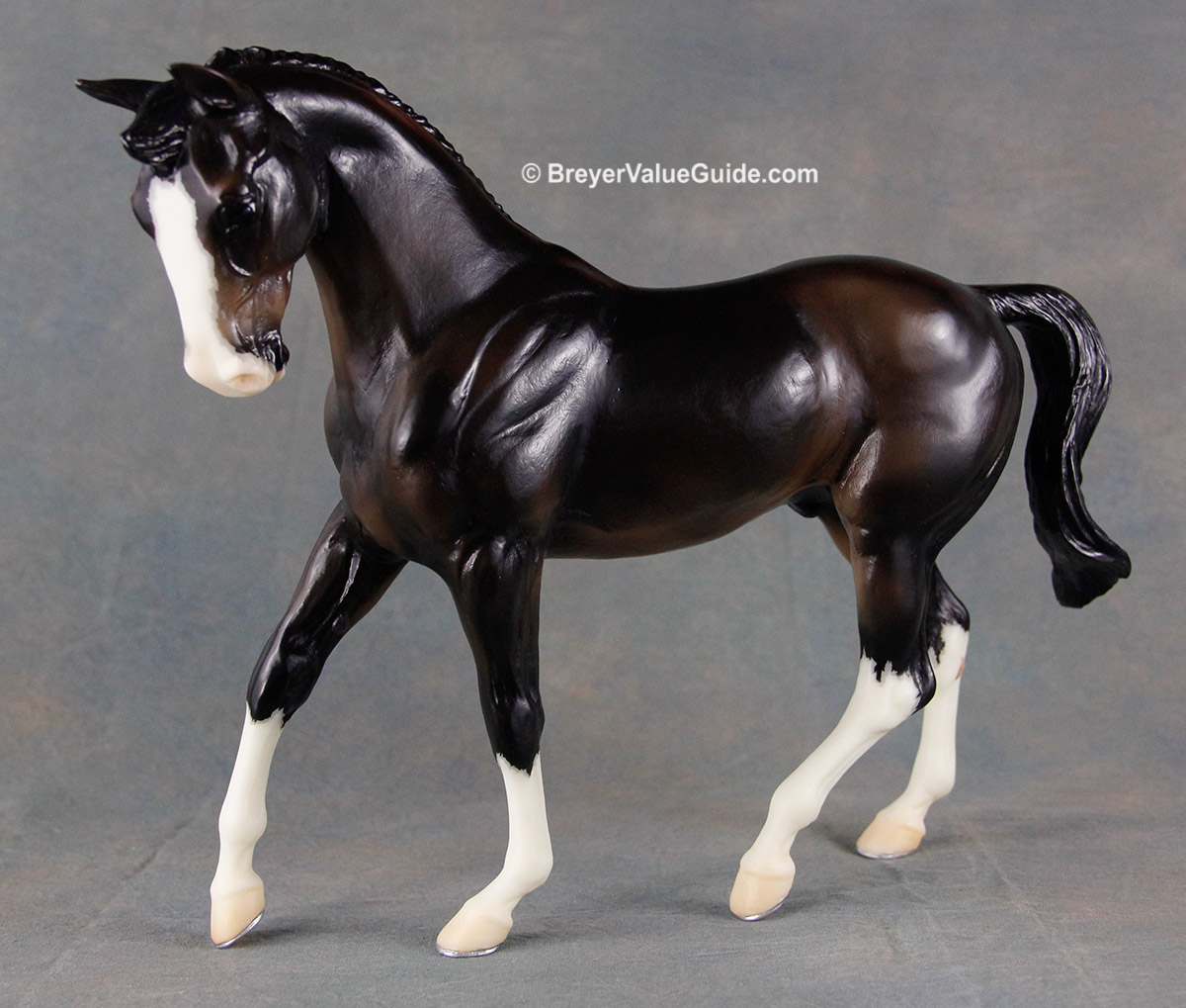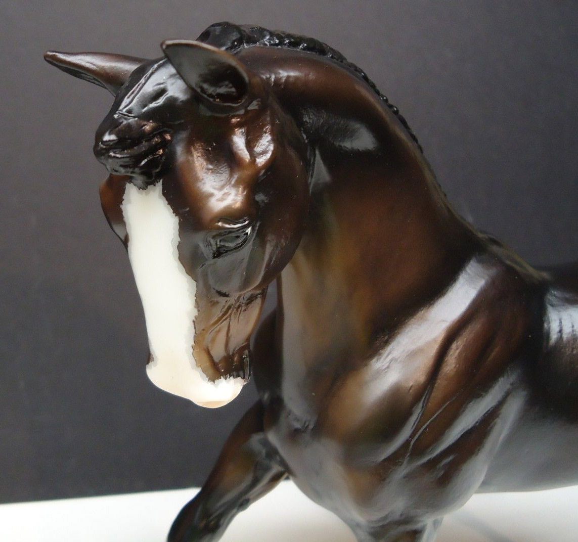 Glossy shaded mahogany bay; wide blaze; pink muzzle; mapped markings; 4 stockings; shoes; BreyerFest Volunteer model SR; 1/120