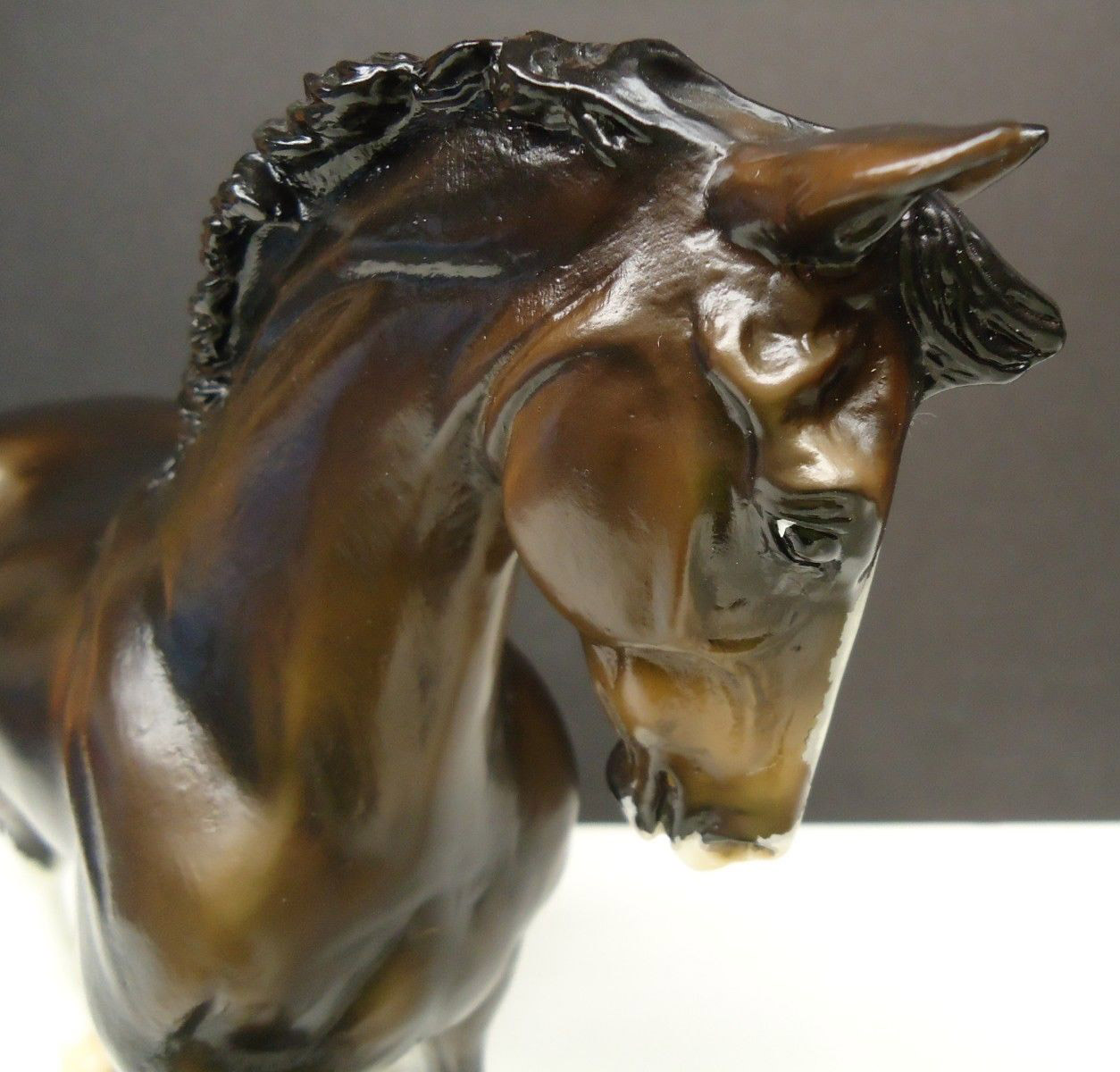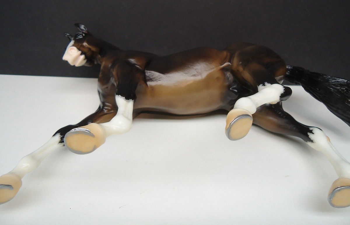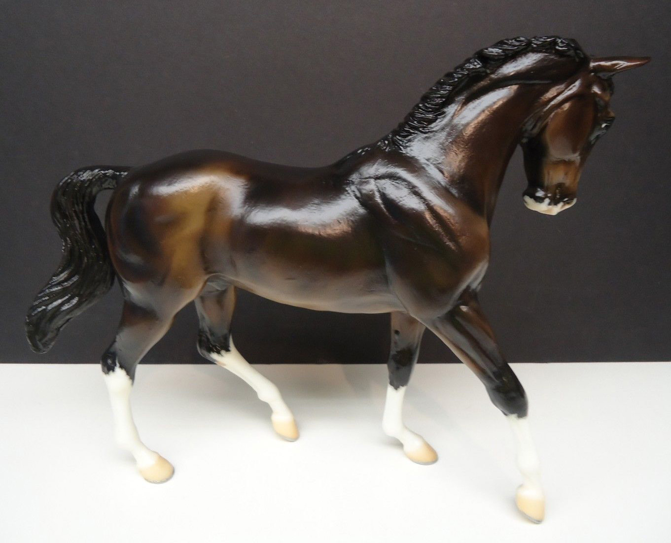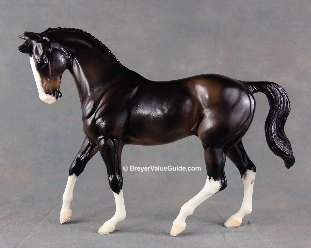Glossy shaded mahogany bay; wide blaze; pink muzzle; mapped markings; 4 stockings; shoes; BreyerFest Volunteer model SR; 1/120