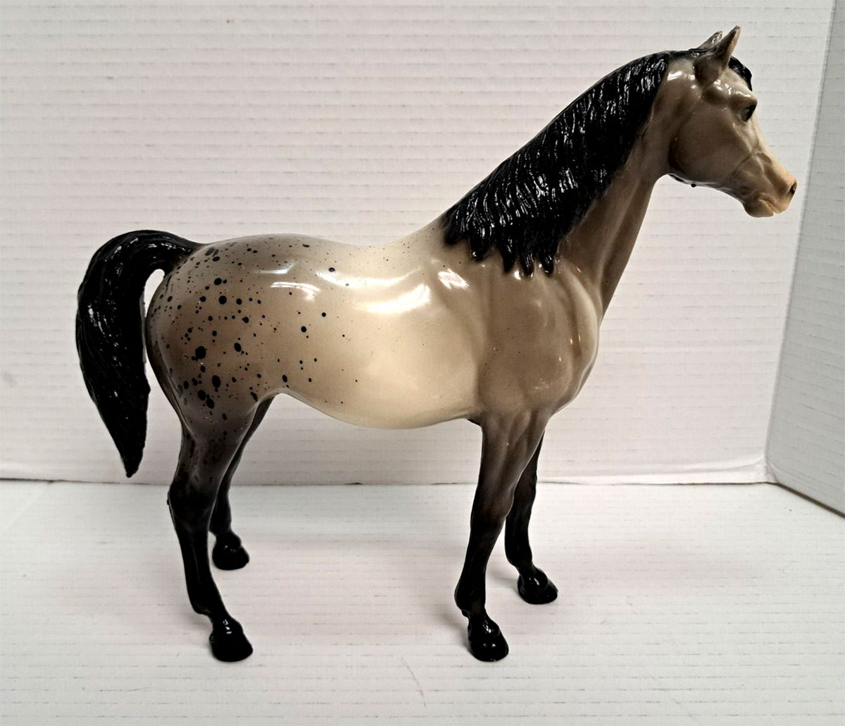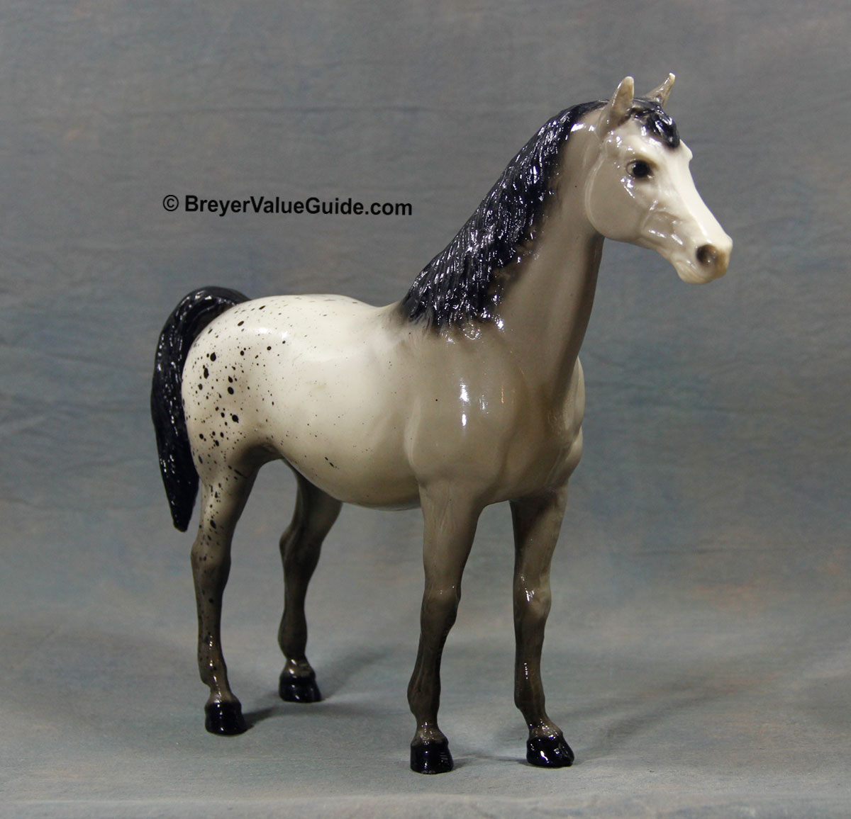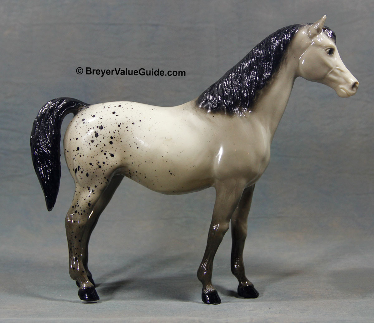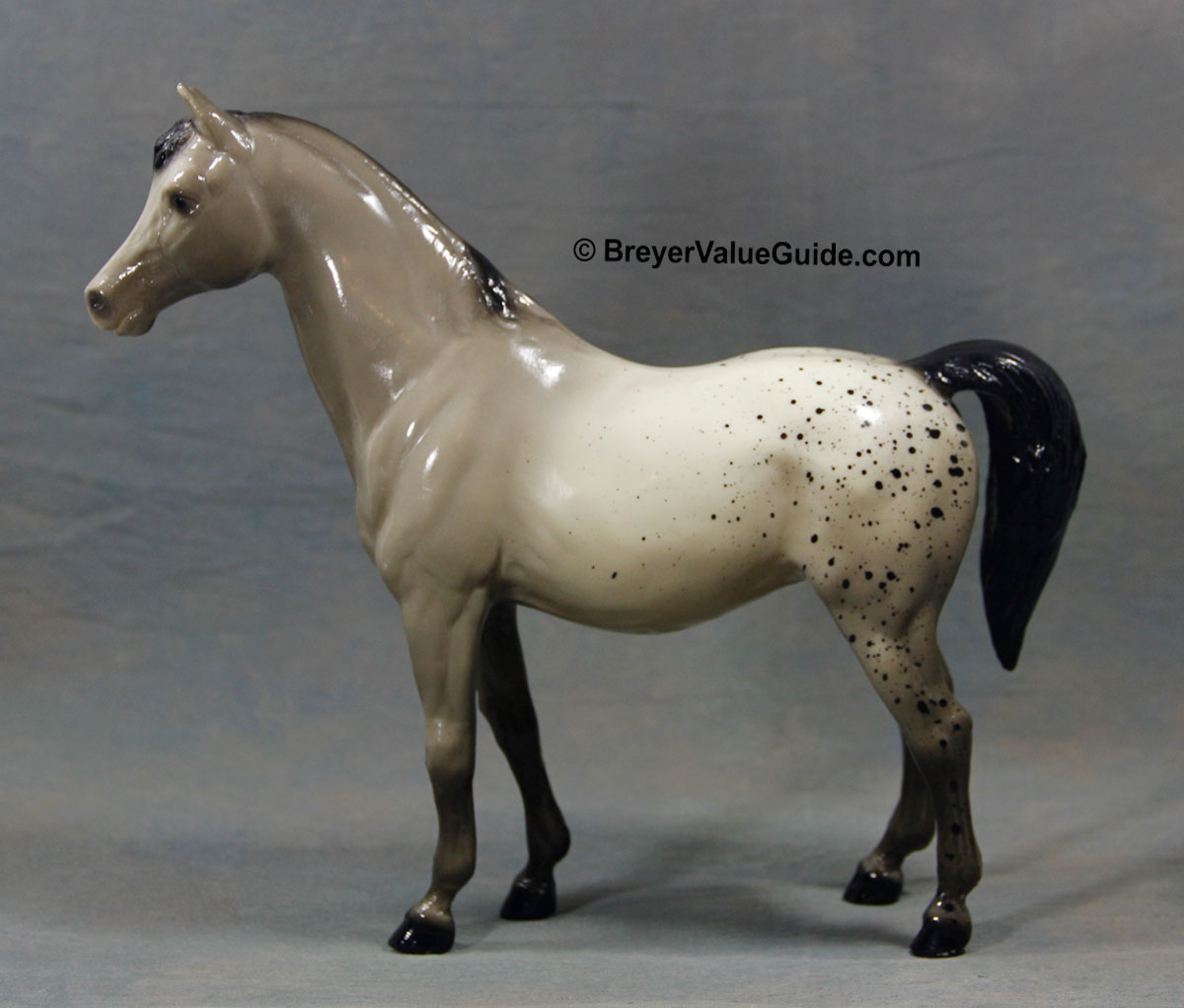 Glossy grey blanket appaloosa or with white barrel and grey hip shaping; black splash spots