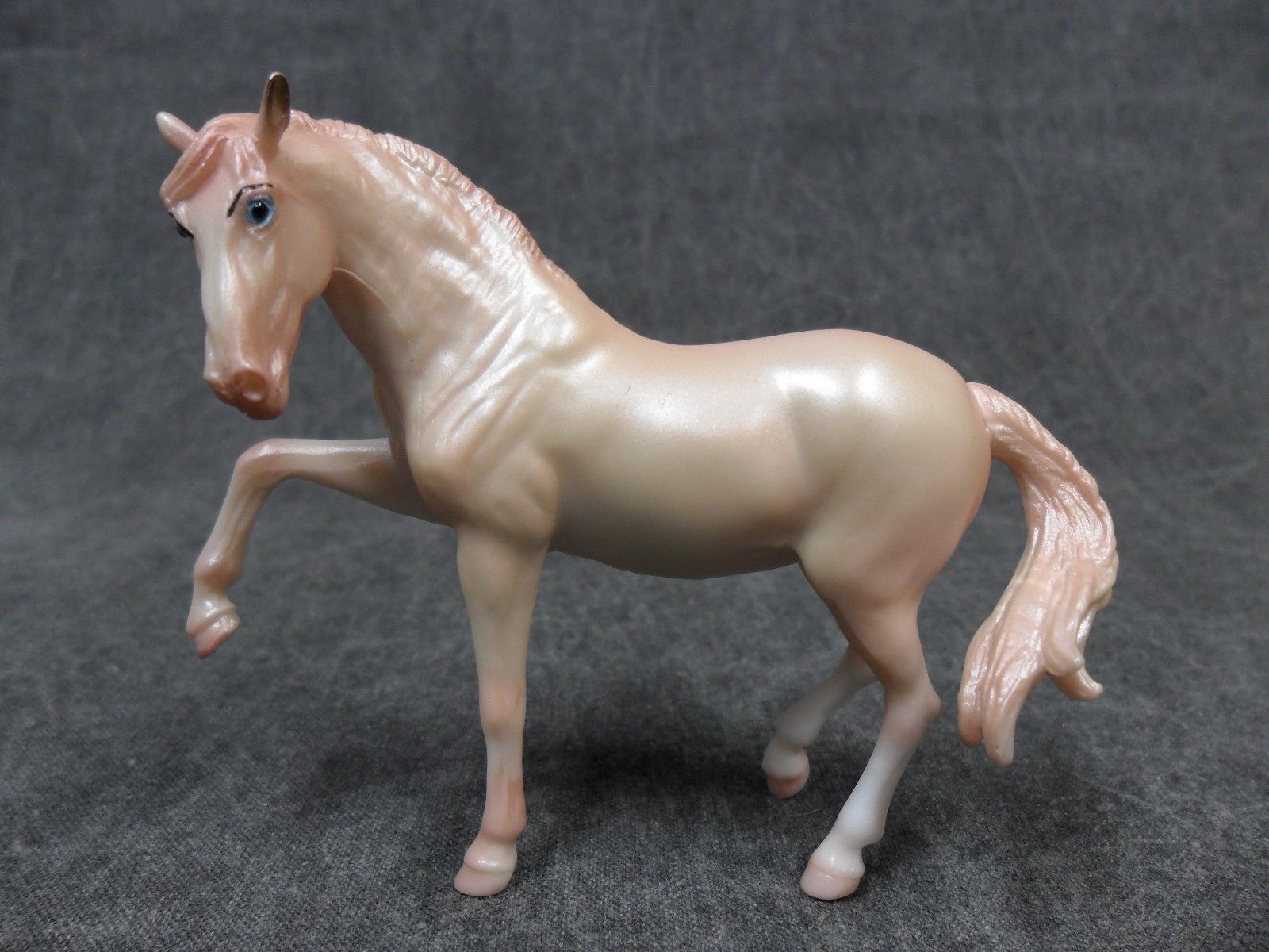 Semi-gloss cremello; blue eyes; eyebrows; 2 hind socks