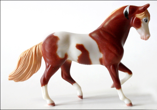 Matte chestnut pinto; flaxen mane and tail; stenciled bald face; feather in mane; 4 socks