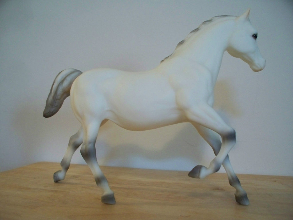 Matte alabaster; grey striped mane and tail; grey shaded points; JCPenney SR – with Running Foal