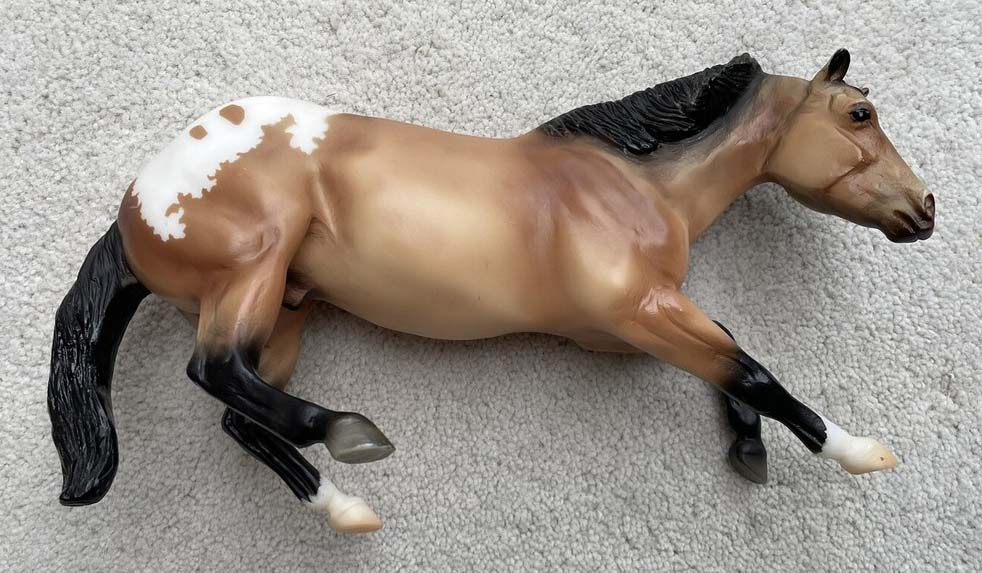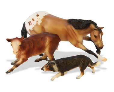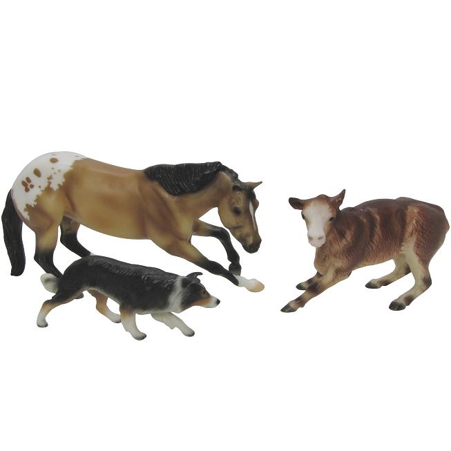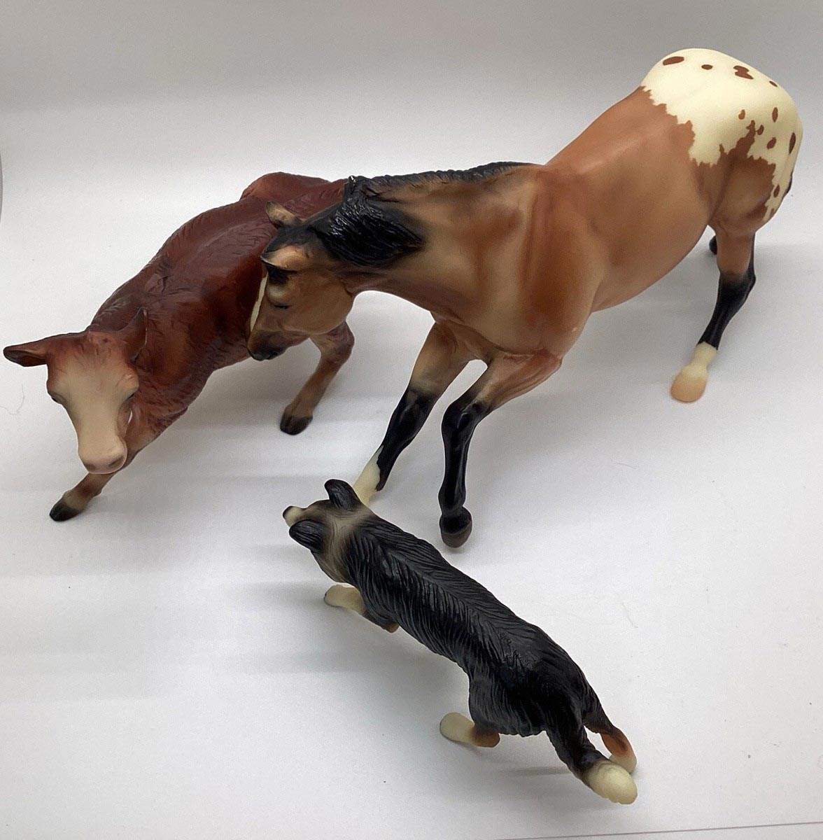 Cutting Horse – Matte buckskin blanket appaloosa, stripe, 2 socks Cutting Calf – shaded red, bald face, shaded legs with Border Collie Valued as set.