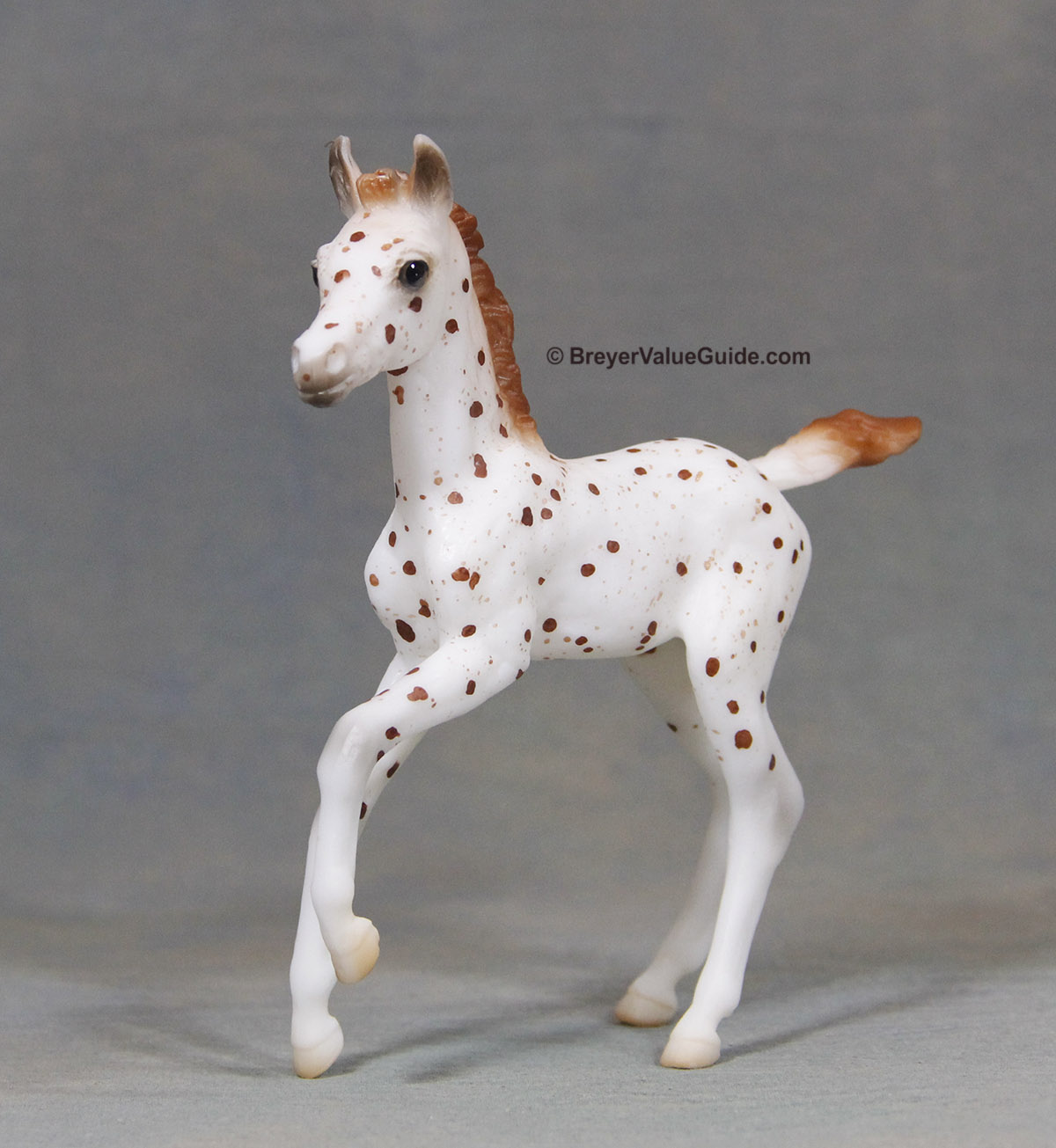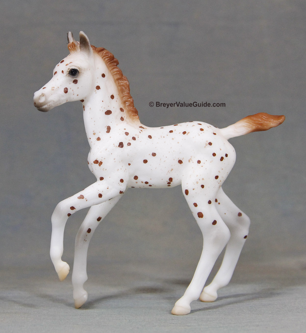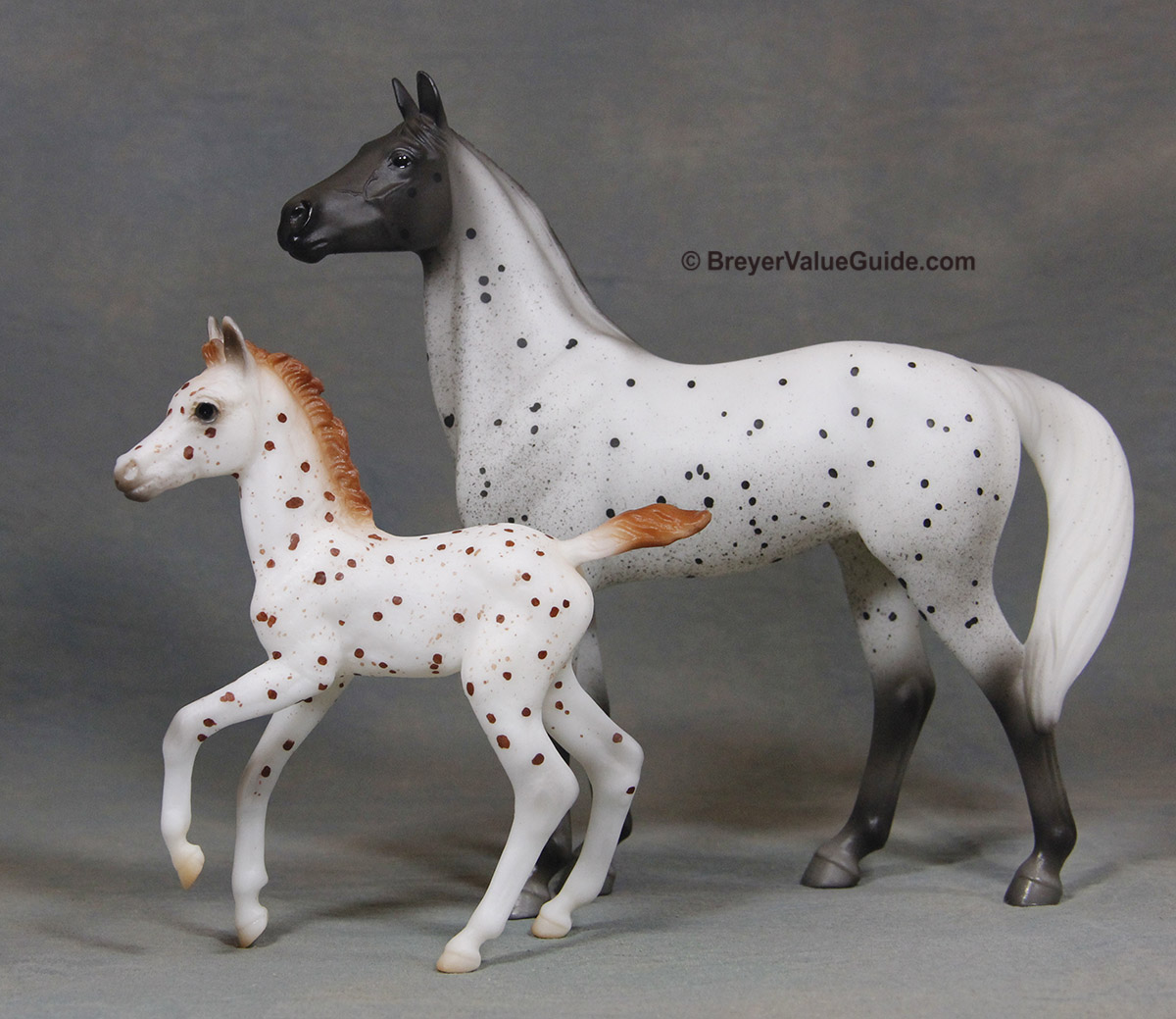 Matte chestnut leopard appaloosa; white with brown splash spots; brown shaded mane and tail – with Standing Thoroughbred Valued as set. Issue price: $30
