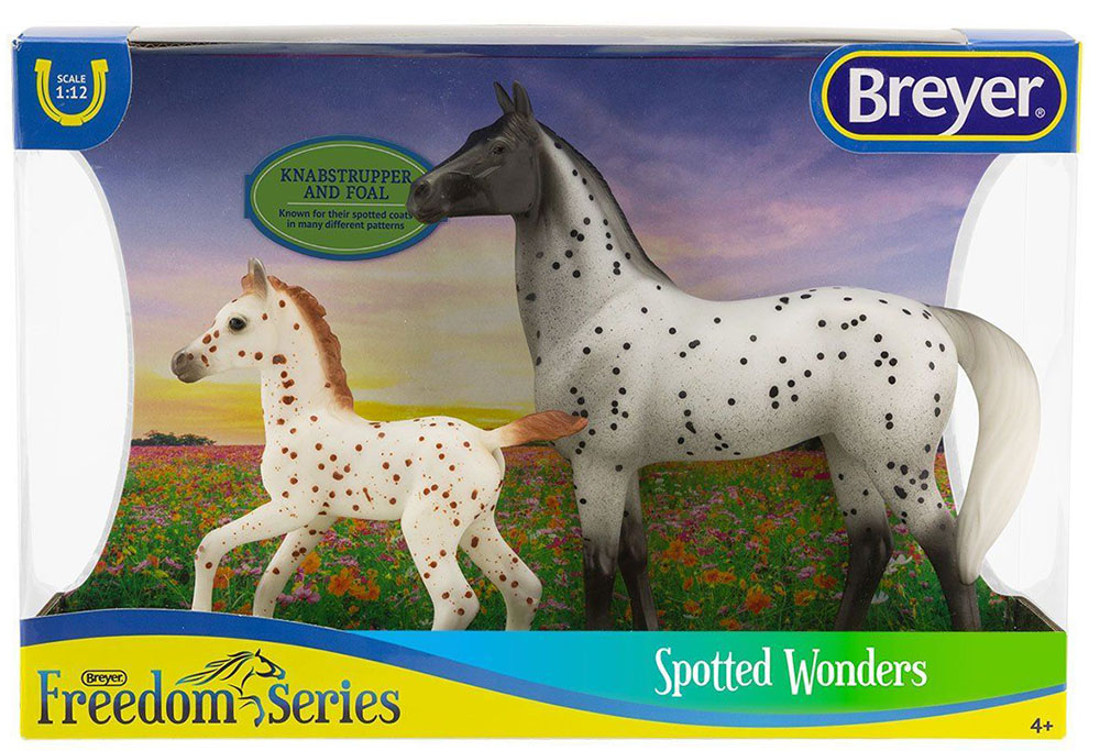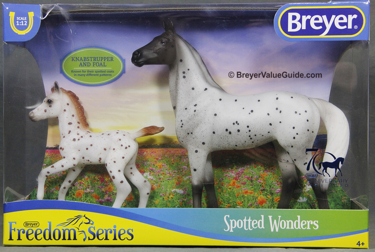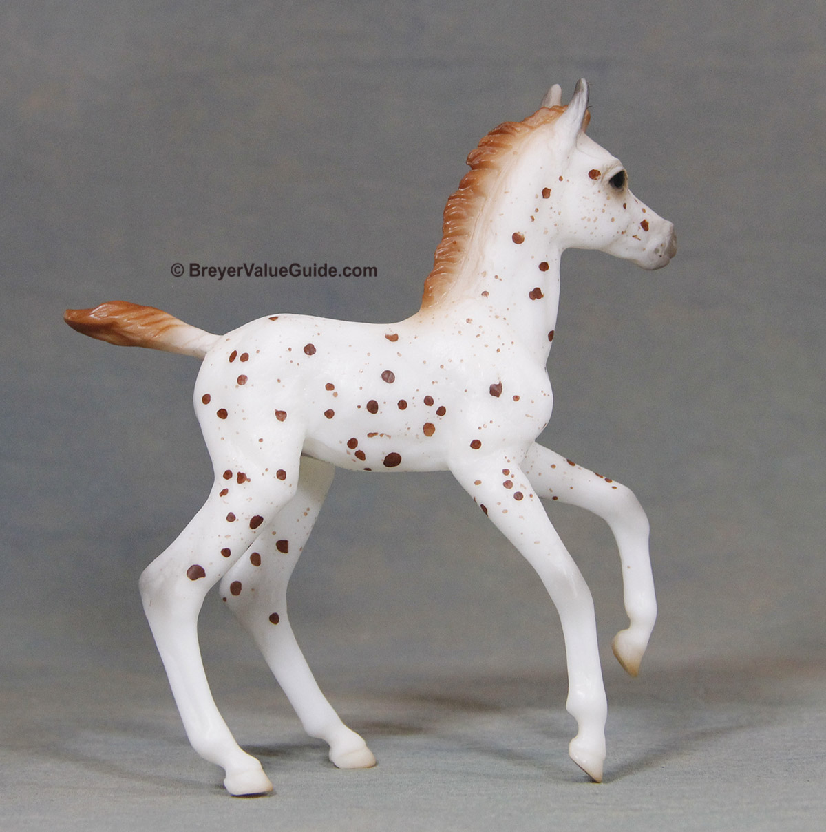 Matte chestnut leopard appaloosa; white with brown splash spots; brown shaded mane and tail – with Standing Thoroughbred Valued as set. Issue price: $30