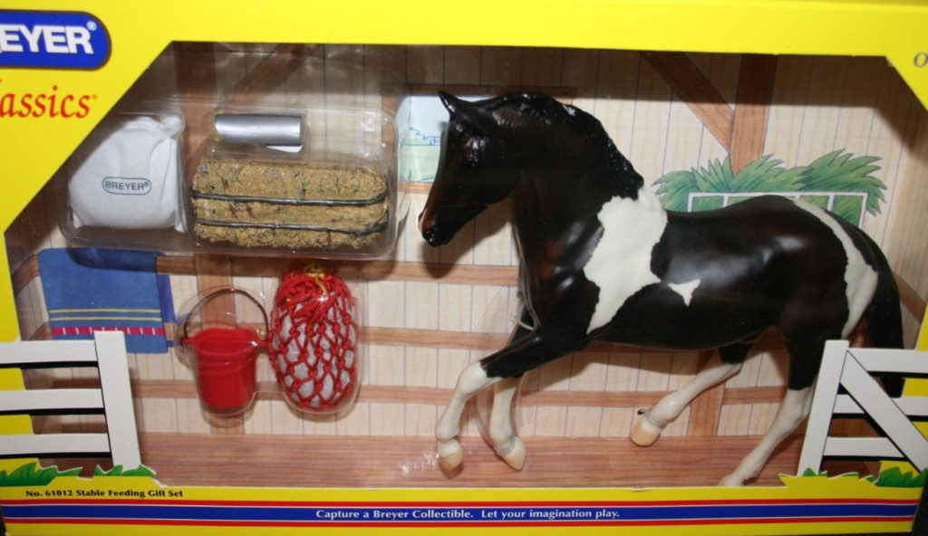 Matte mahogany bay pinto; snip; 4 stockings; includes feeding accessories