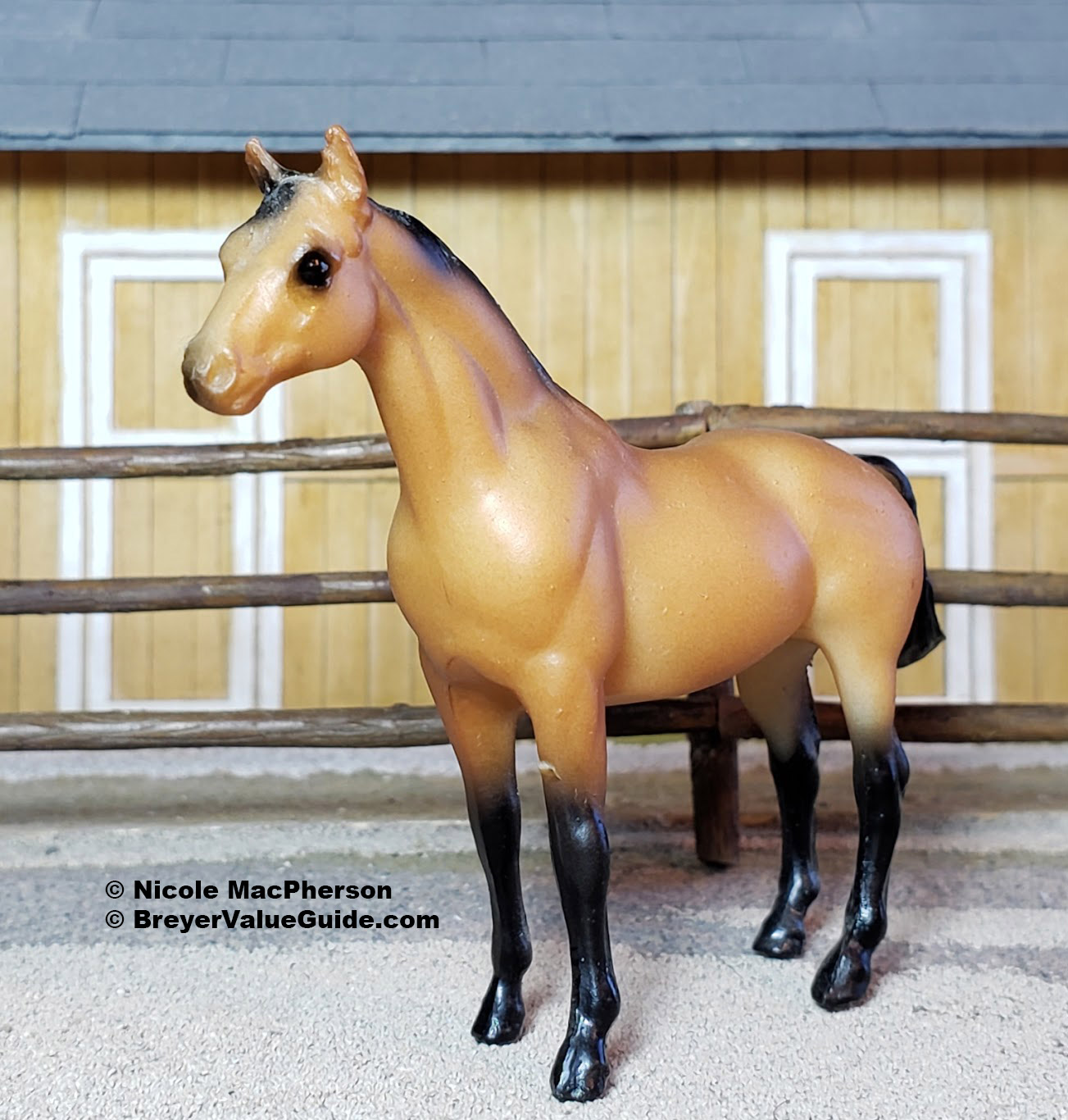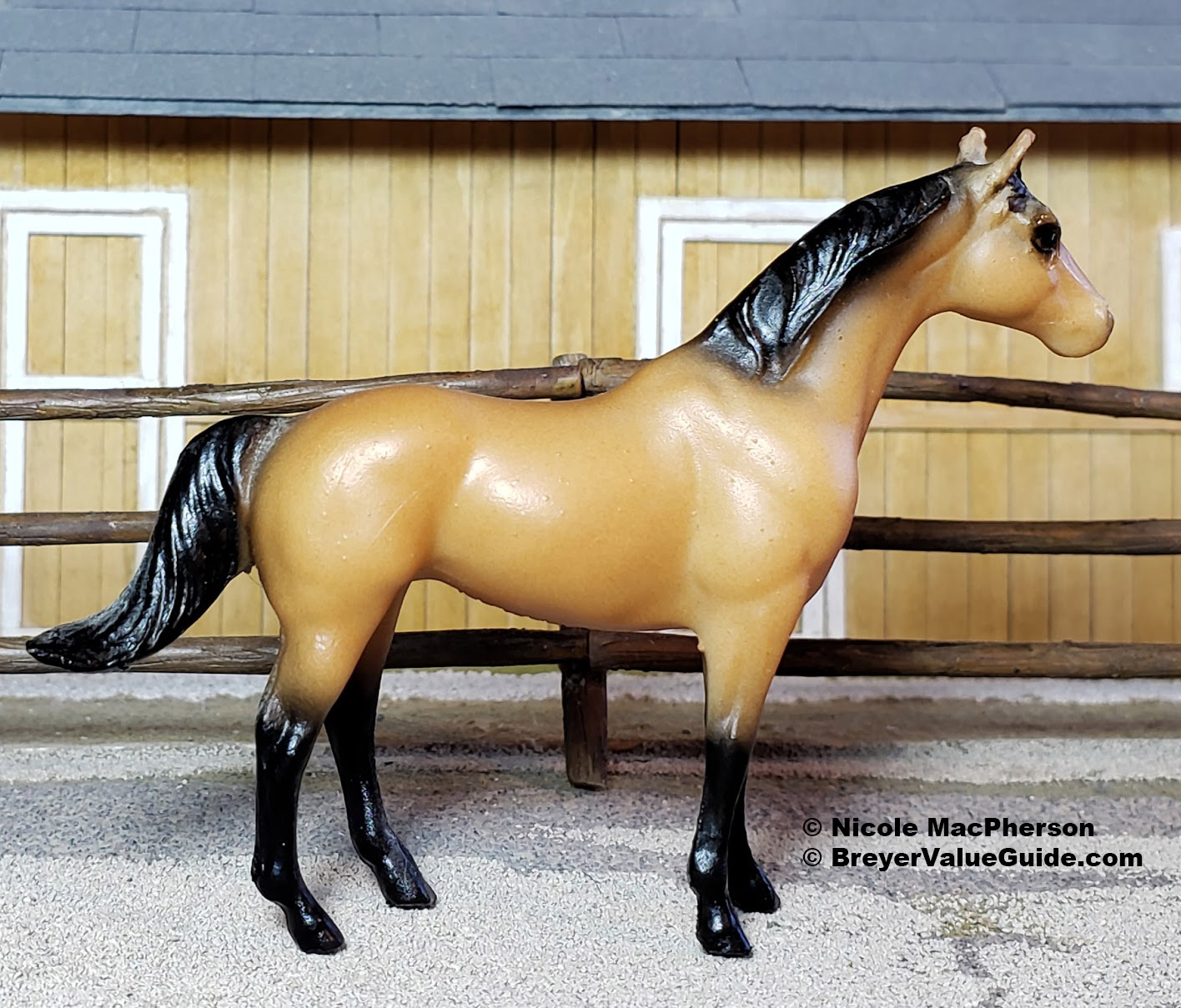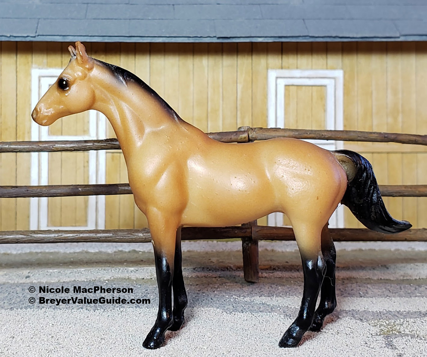 Matte to semigloss buckskin; black points; no socks; Sears SR