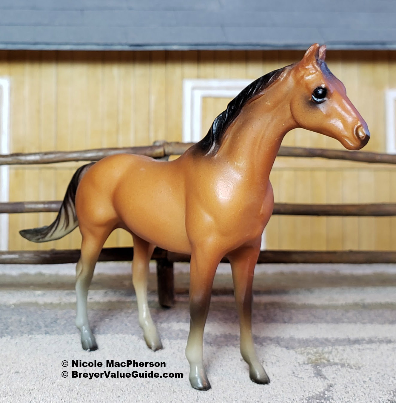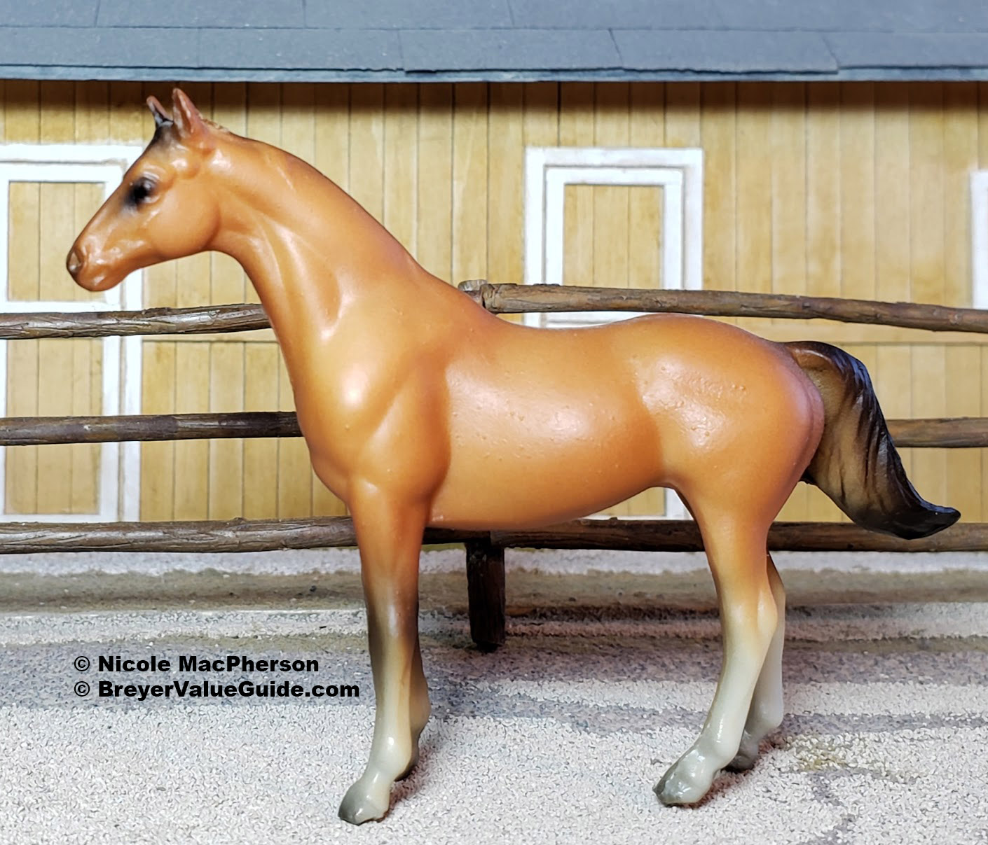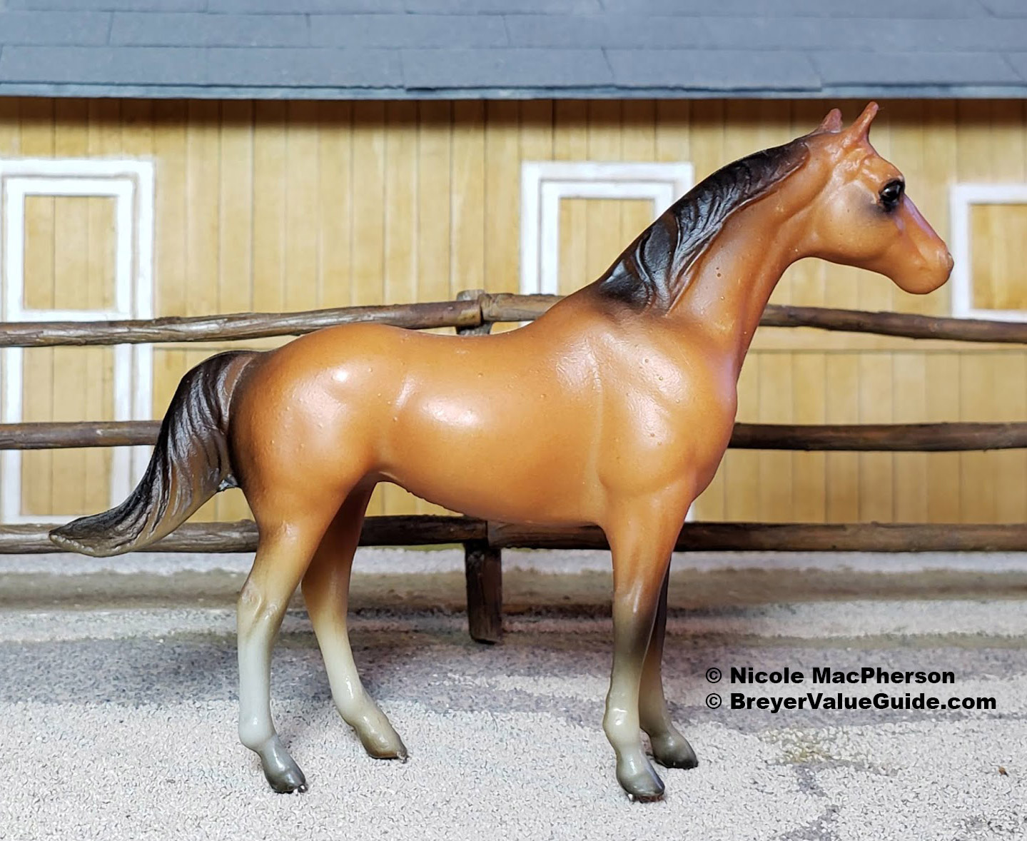 Matte light bay to buckskin; black points; 4 socks; Sears SR