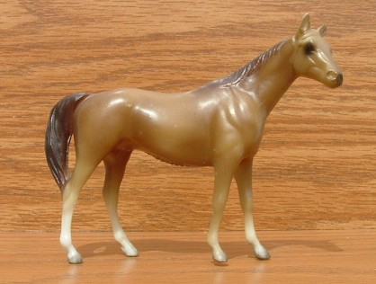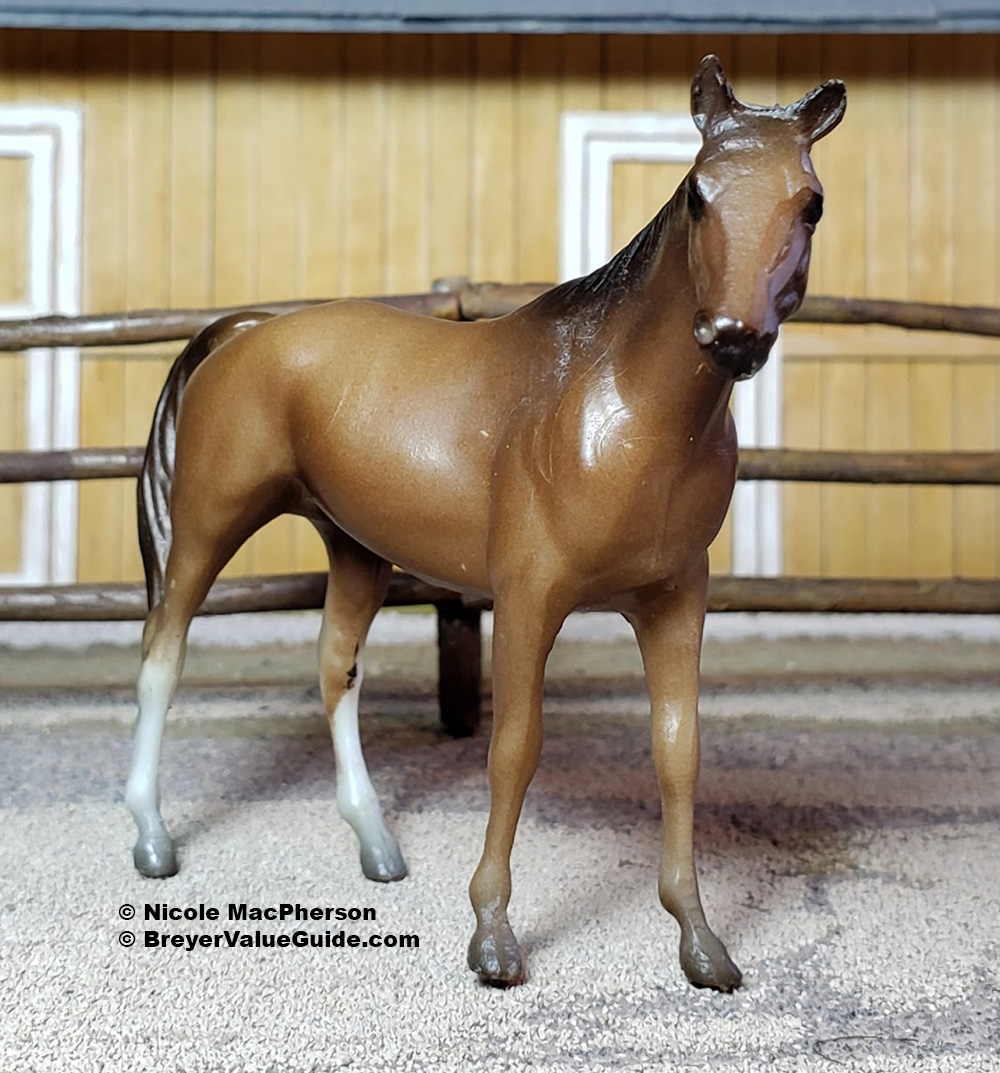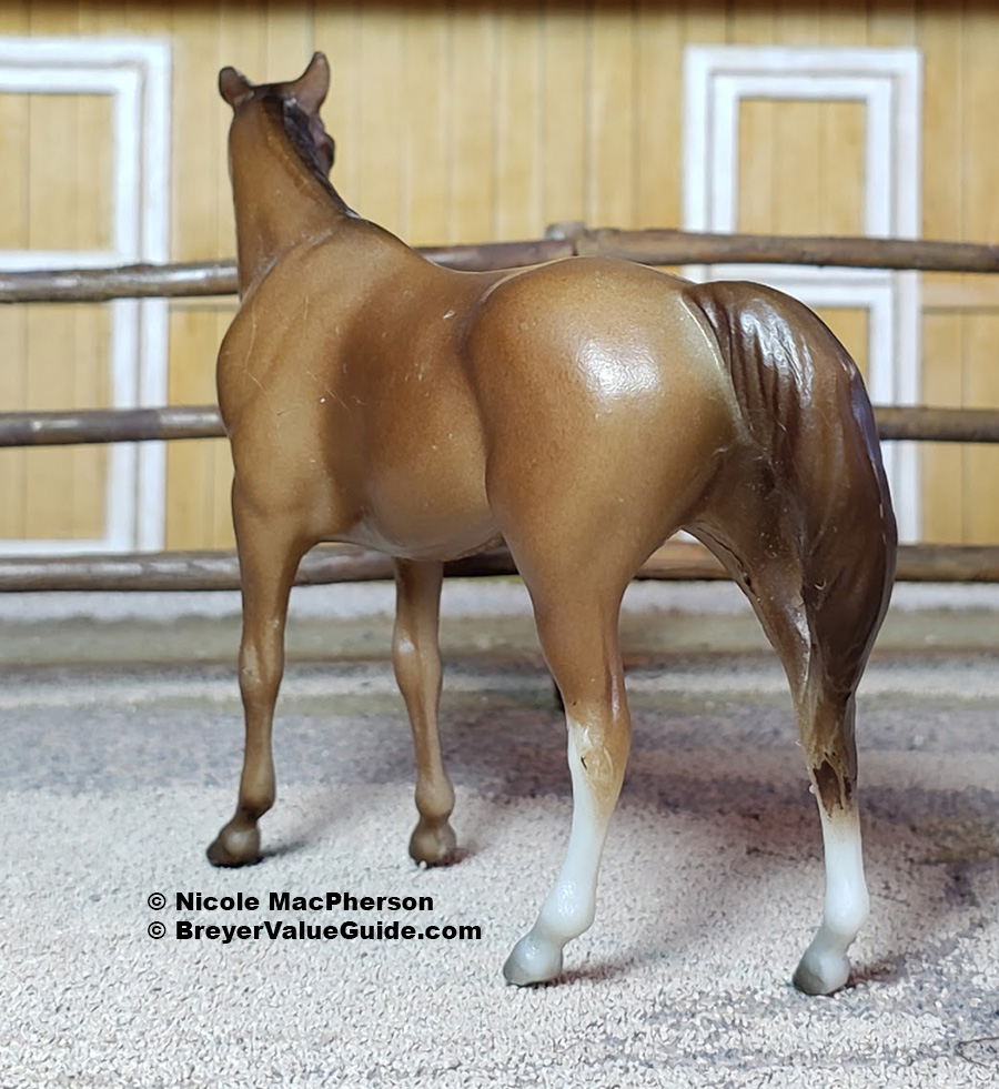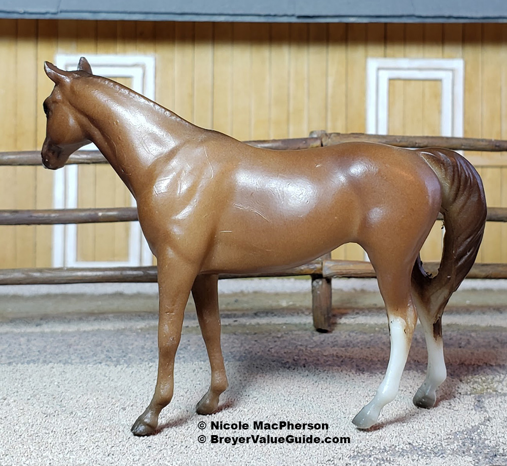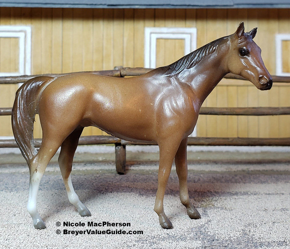 Matte chestnut; darker mane and tail; socks; Sears SR