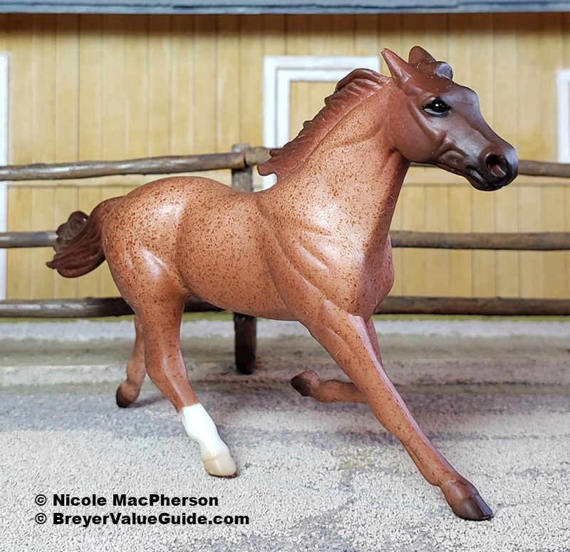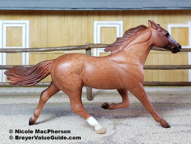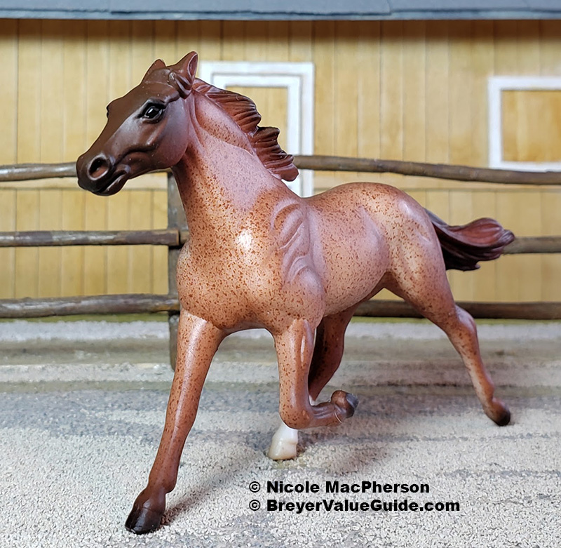 Matte red roan; solid face; darker mane and tail; 1 hind sock