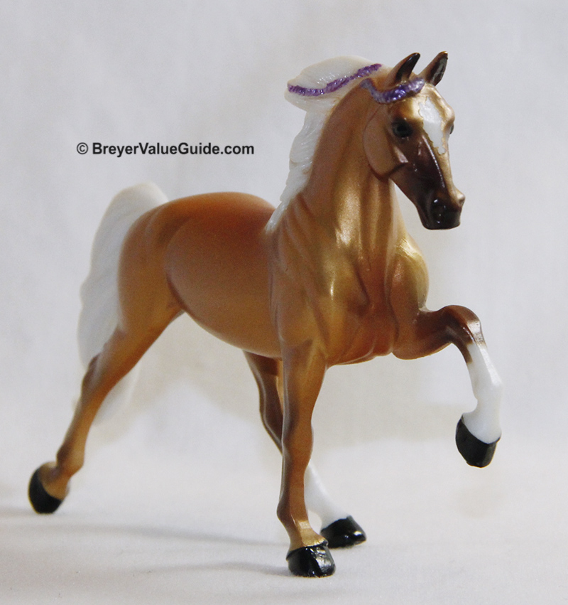 Matte palomino; star; 2 socks; black hooves; purple ribbons