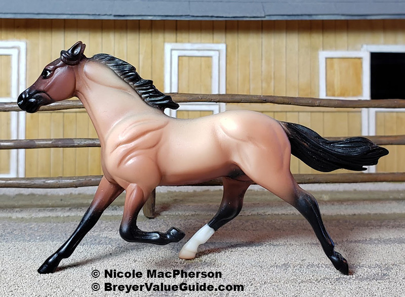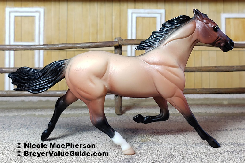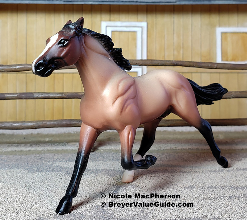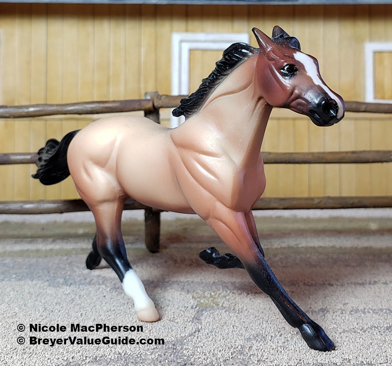 Matte bay roan; stripe-snip; 1 hind sock; K-Mart release – with Appaloosa