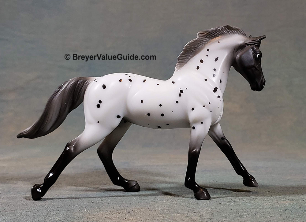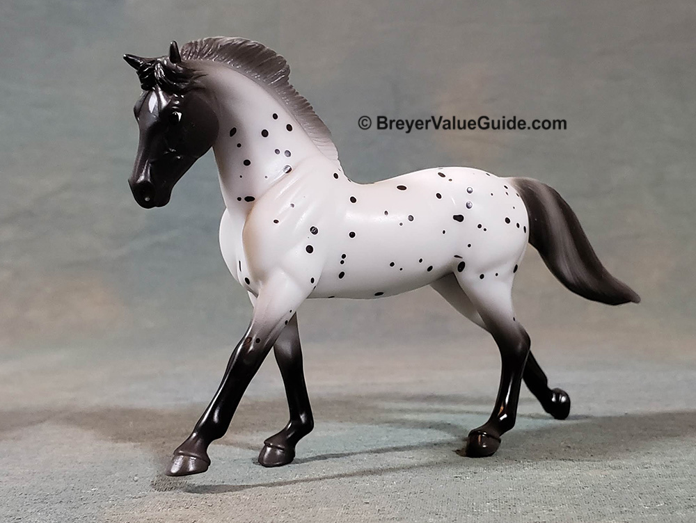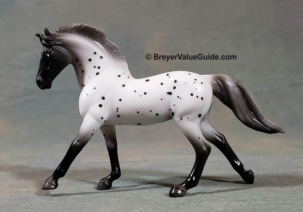 Matte black leopard appaloosa; diamond star; shaded mane and tail; black face and legs; JCPenney SR