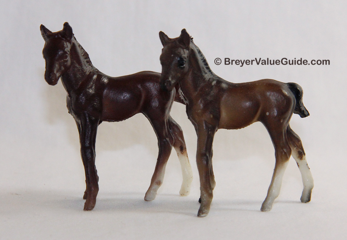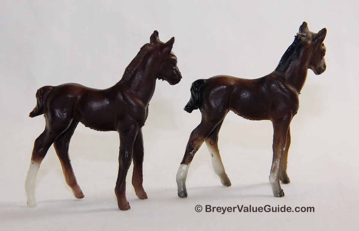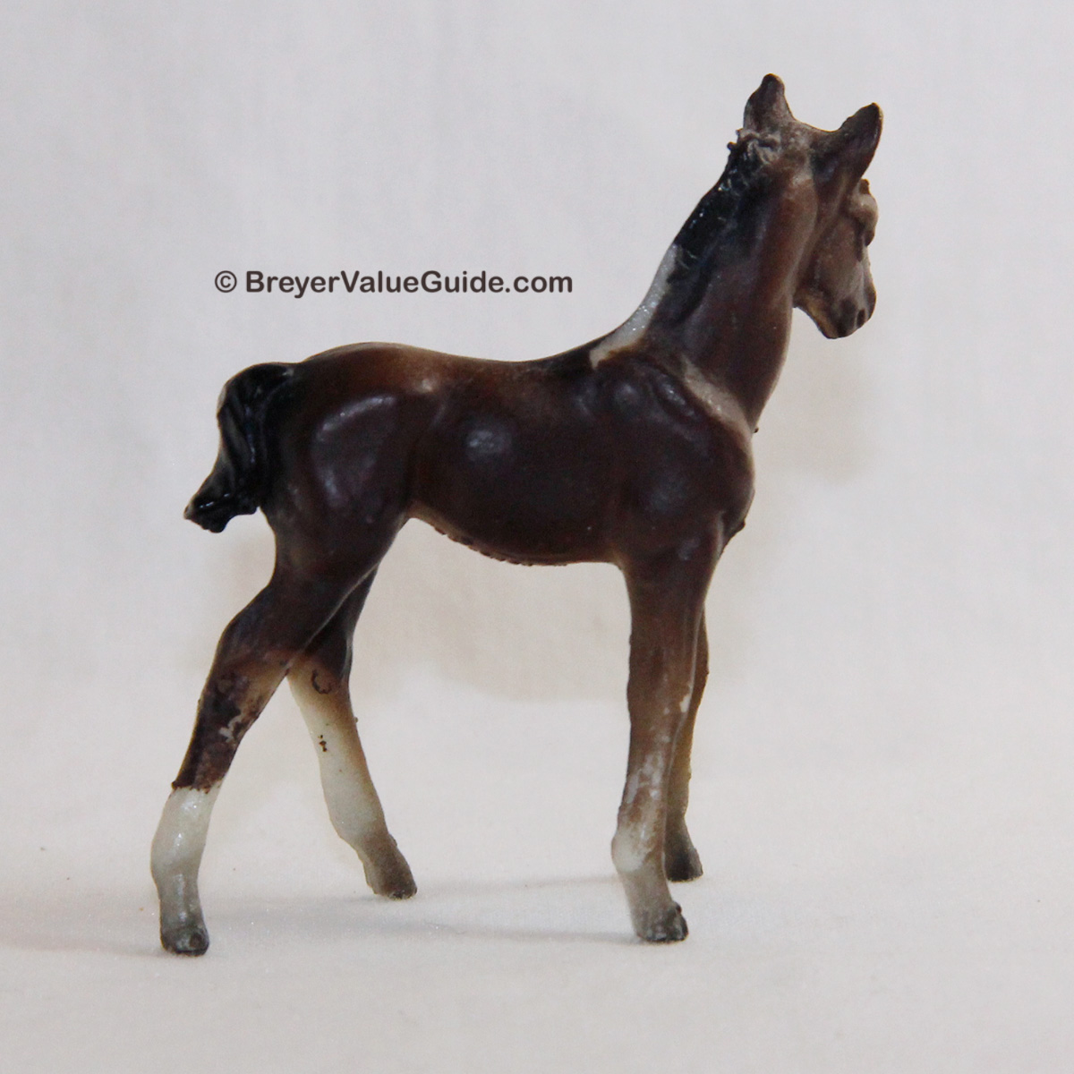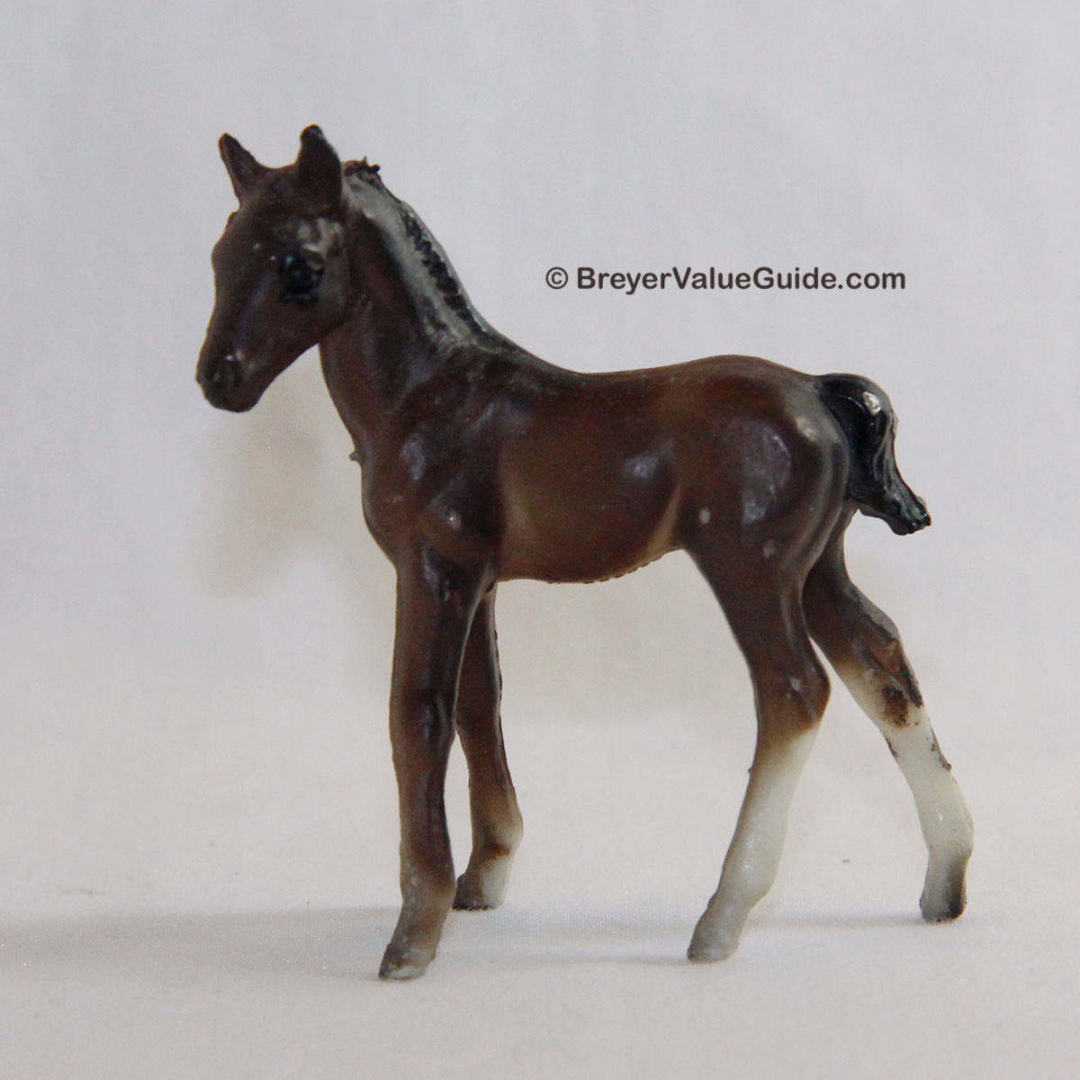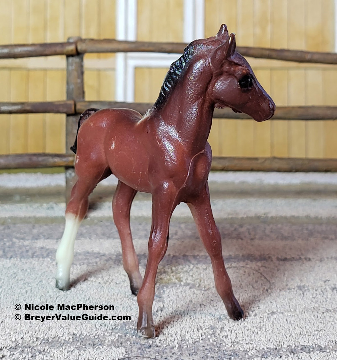 Matte dark bay; various or no socks- with QH Stallion, QH Mare, Thoroughbred Lying Foal Included cardboard stable.