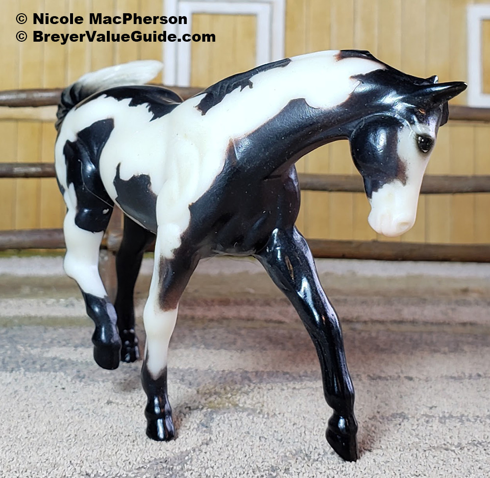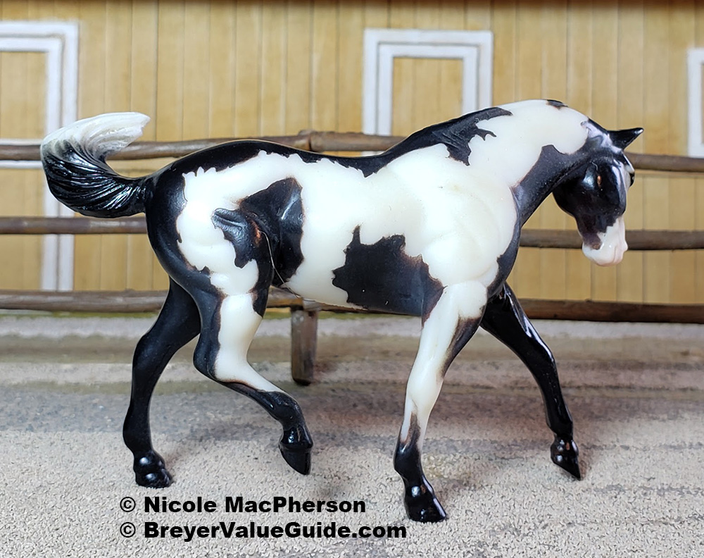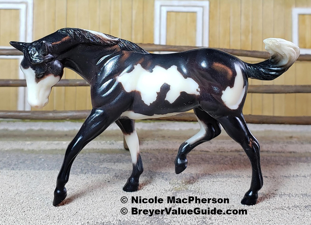 Semi-gloss black pinto; stenciled bald face; black legs; bi-color tail Also released in #5315 Annie Oakey Stablemates Play Set