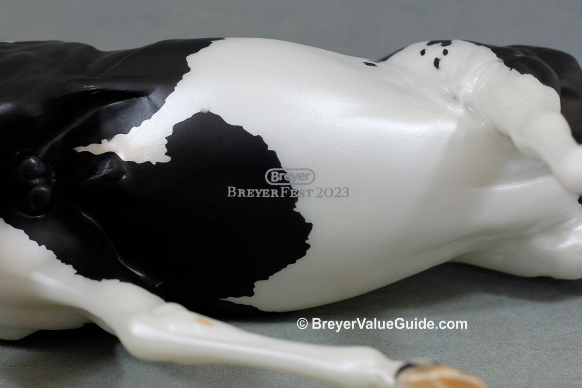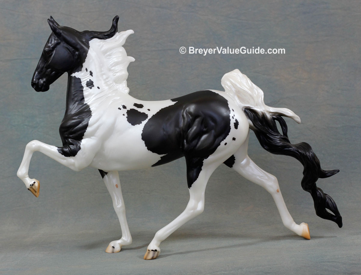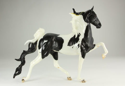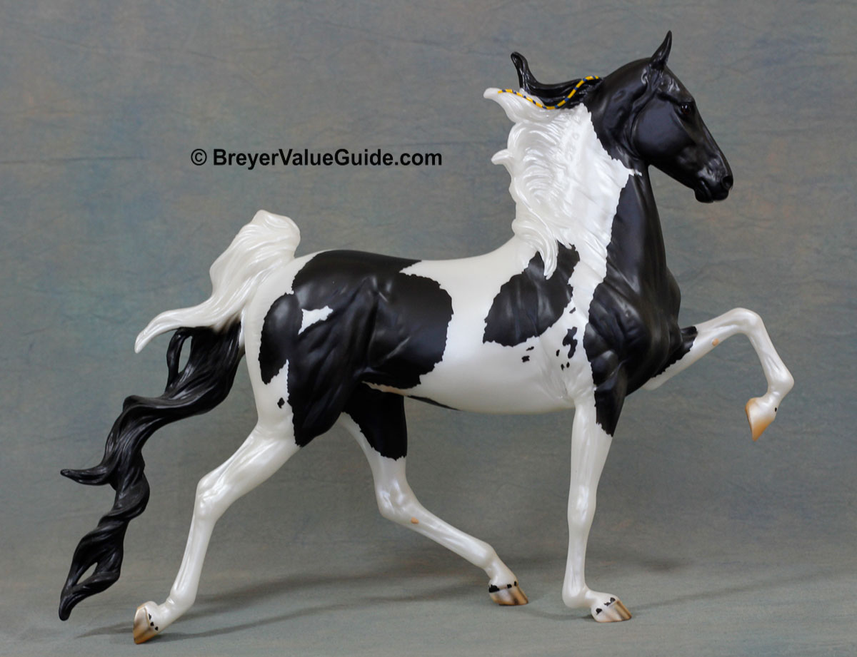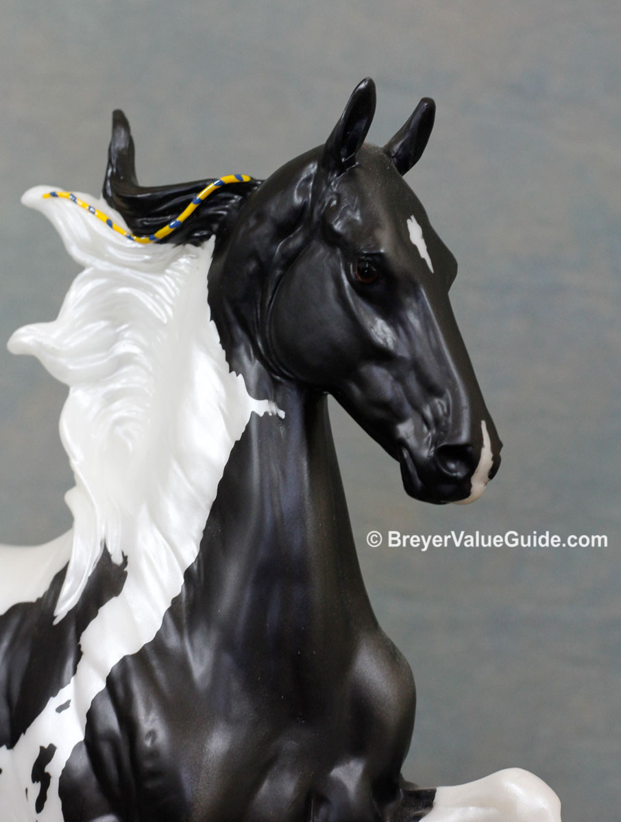Pearly black and white pinto, star and snip, white legs, striped hooves, yellow and blue ribbon, BreyerFest SR, 1/1250 matte
