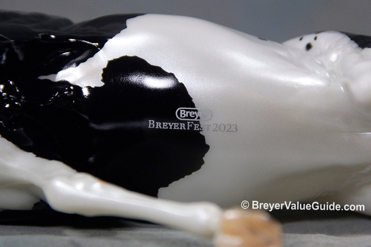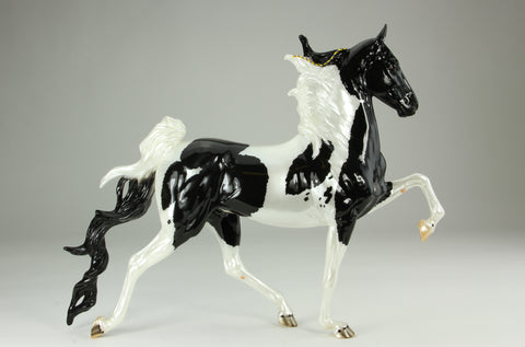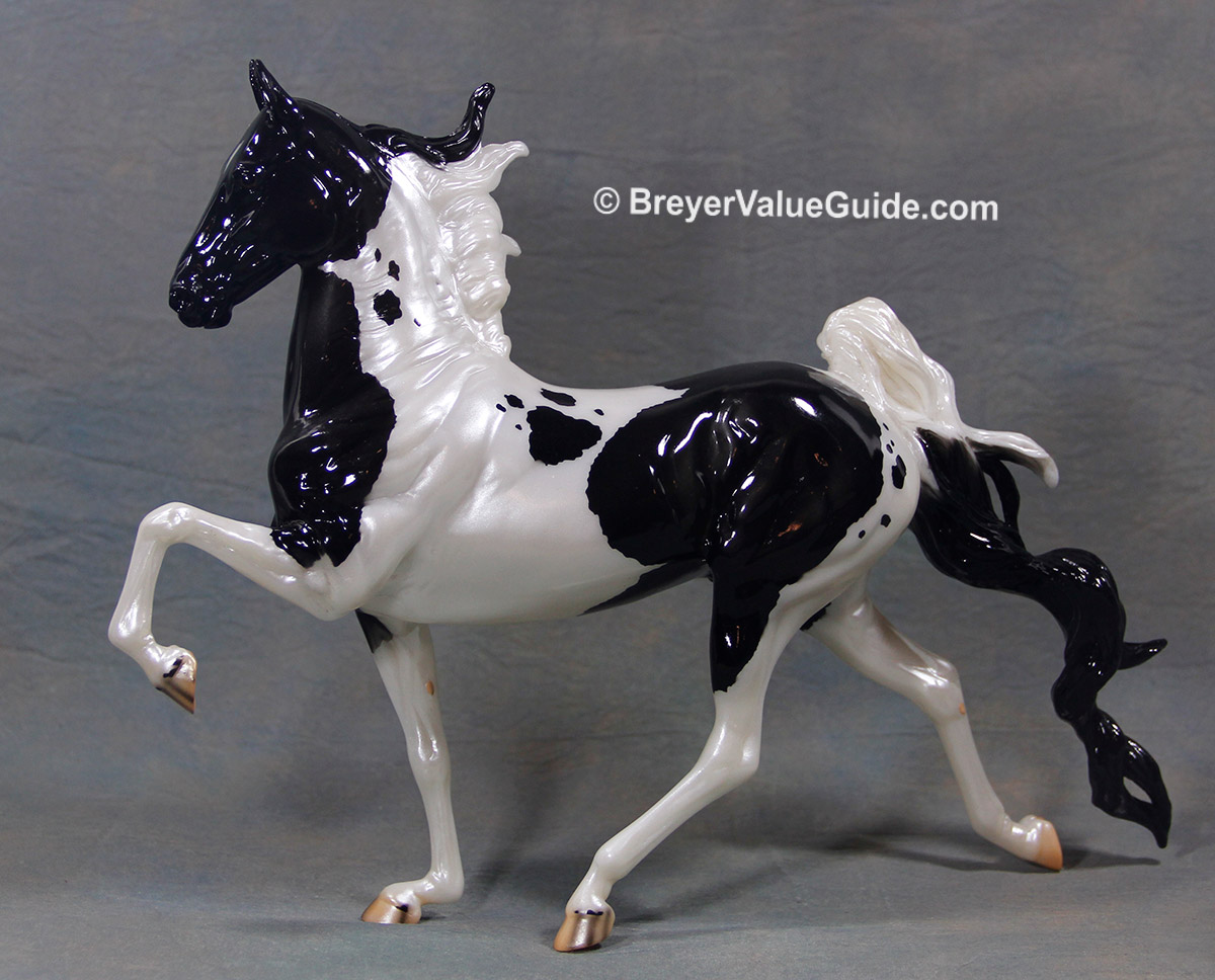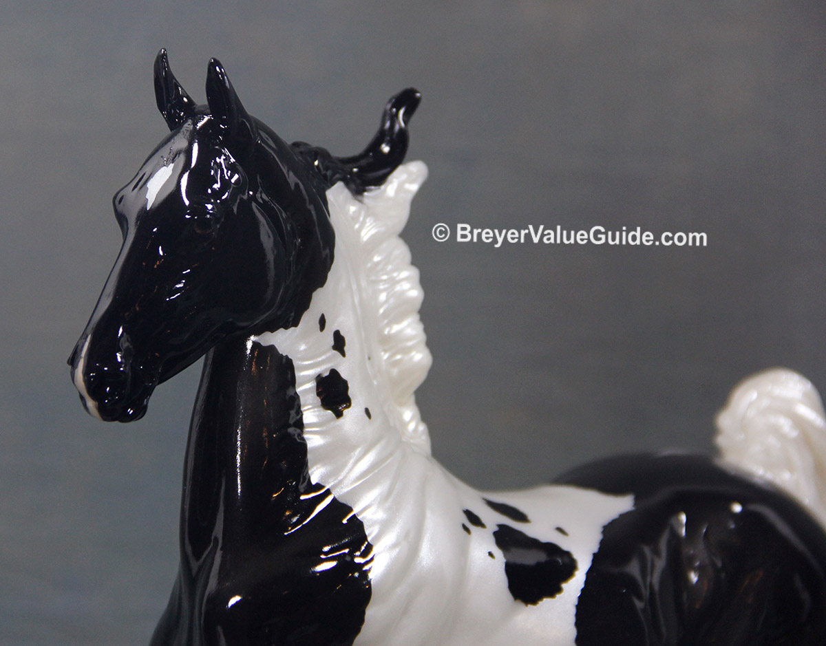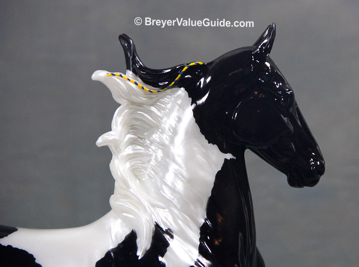 Glossy black and white pinto, star and snip, white legs, striped hooves, yellow and blue ribbon, BreyerFest SR, 1/375 glossy