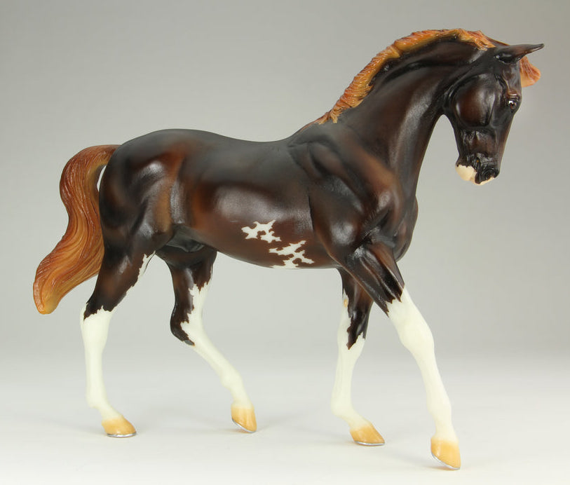 Matte shaded liver chestnut sabino pinto, blaze over muzzle, 4 stockings, painted shoes, BreyerFest Prize SR, 1/10