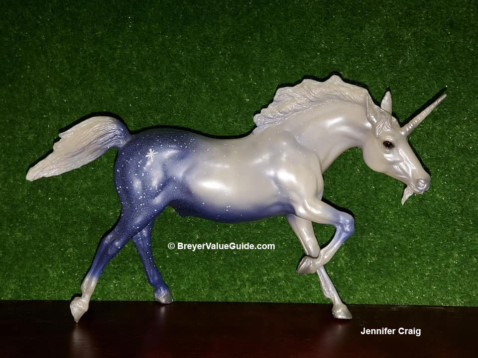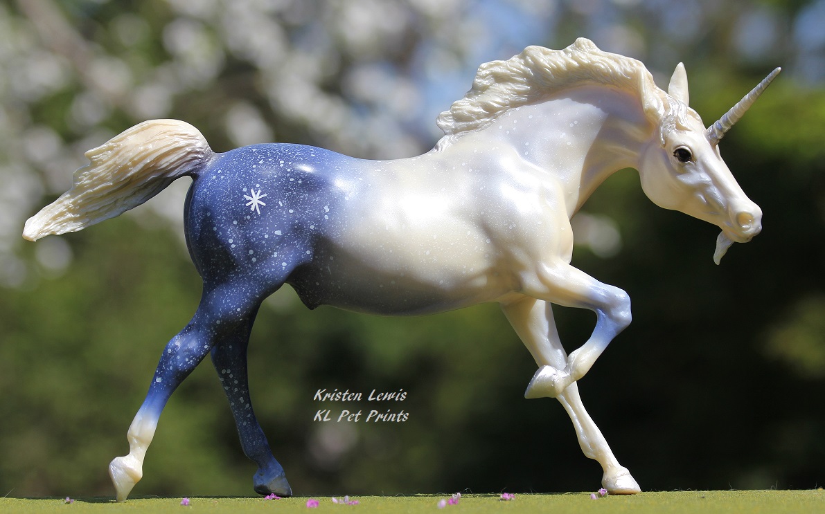 Metallic white and blue with star field as appaloosa pattern; added beard; gold and white striped horn