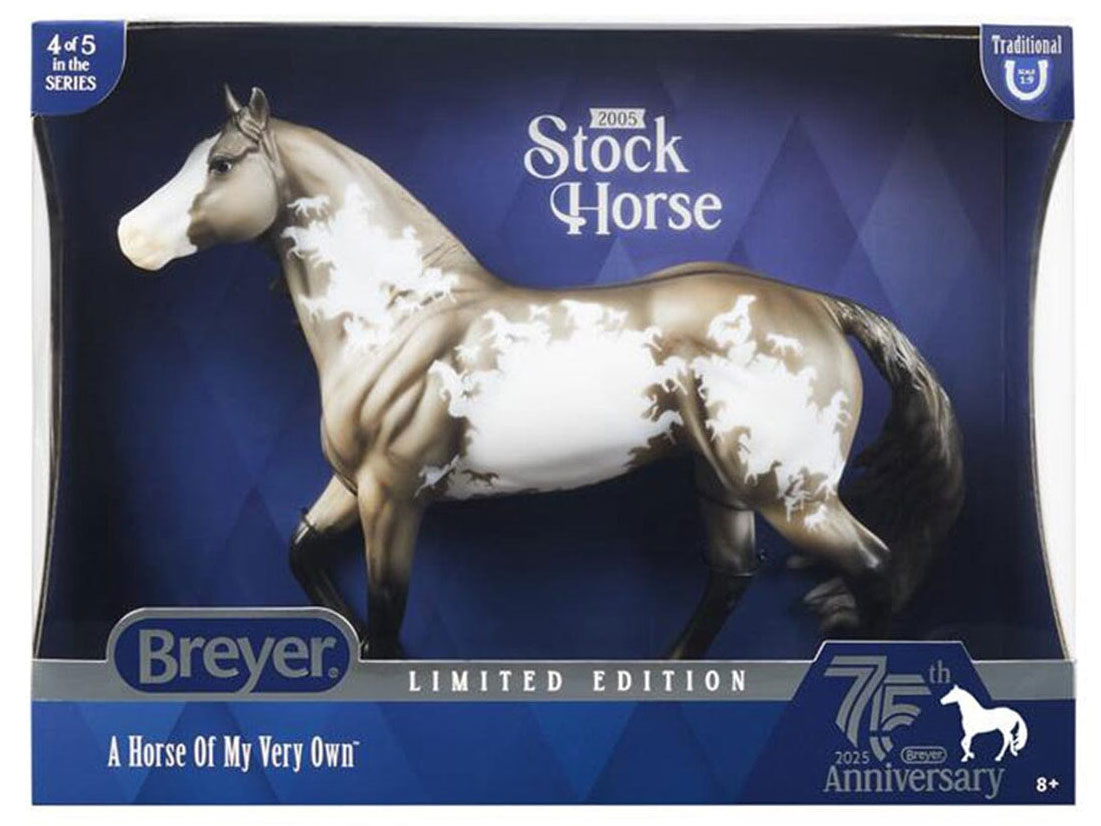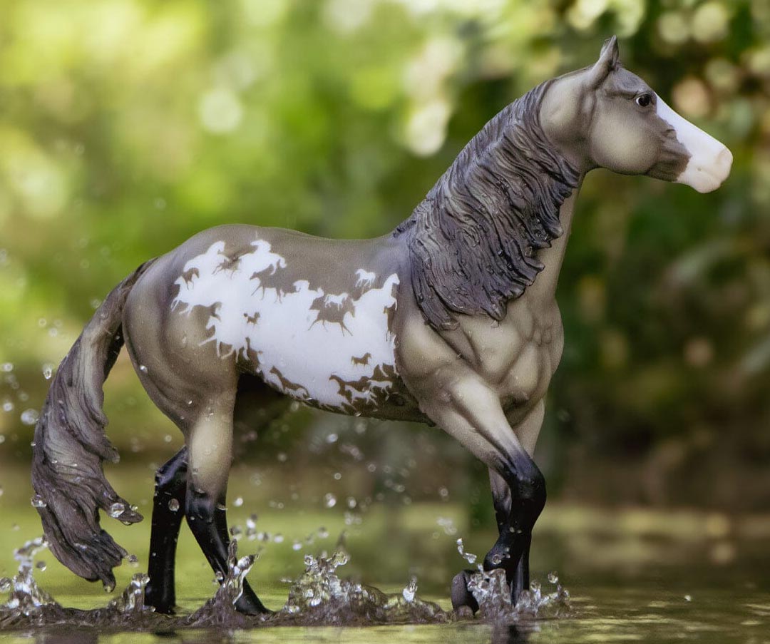 Matte grullo pinto, wide blaze over muzzle, tiny Breyer model silhouettes in pattern, Limited Edition Issue price: $65