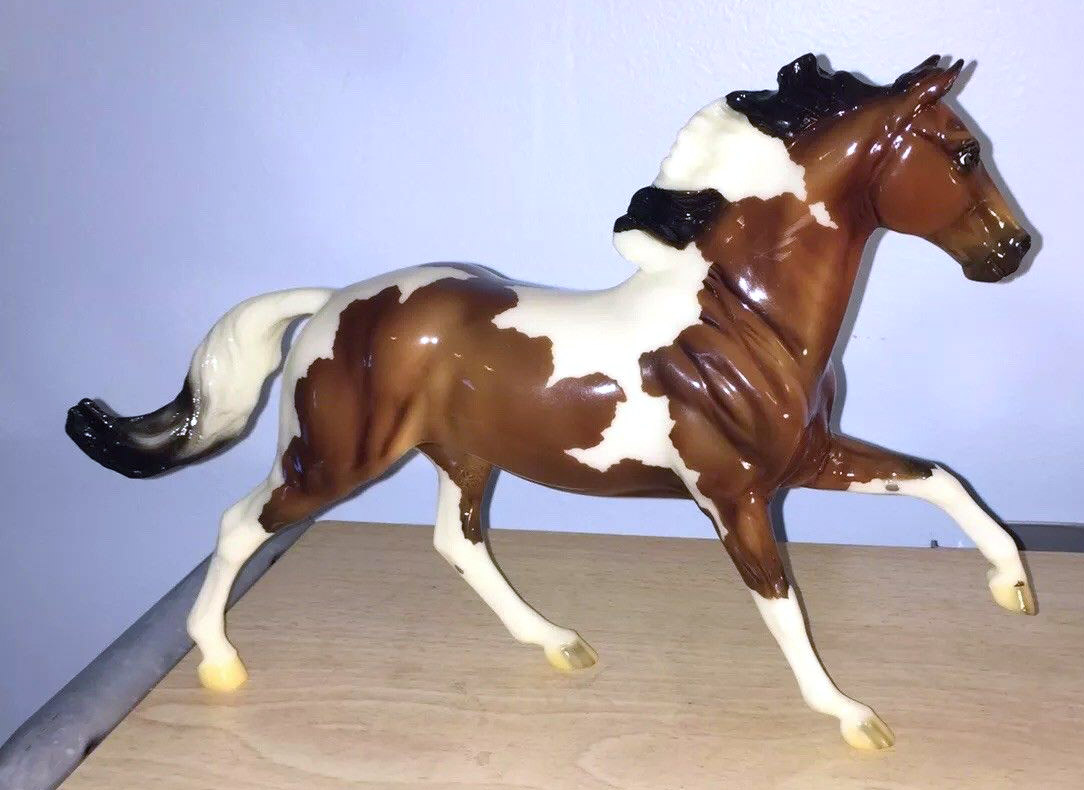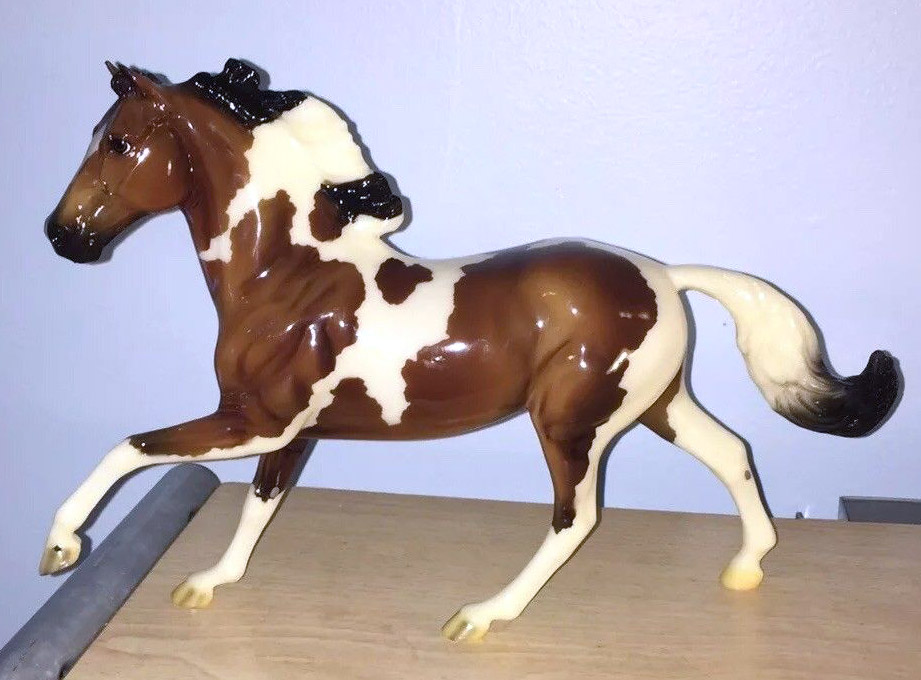 Glossy bay pinto; large star; snip; 4 stockings; striped hooves; BreyerFest SR; 1/54