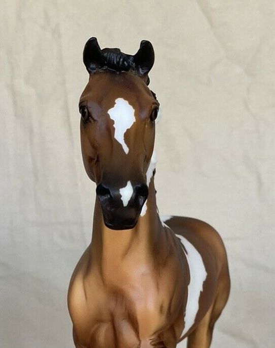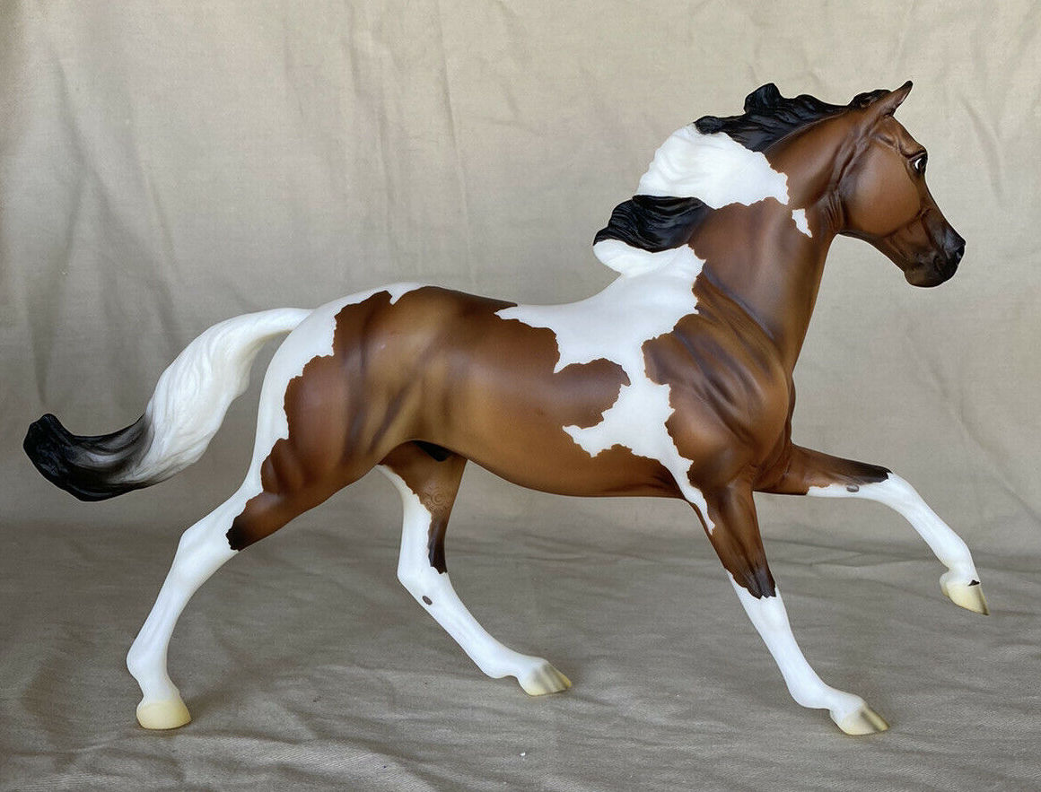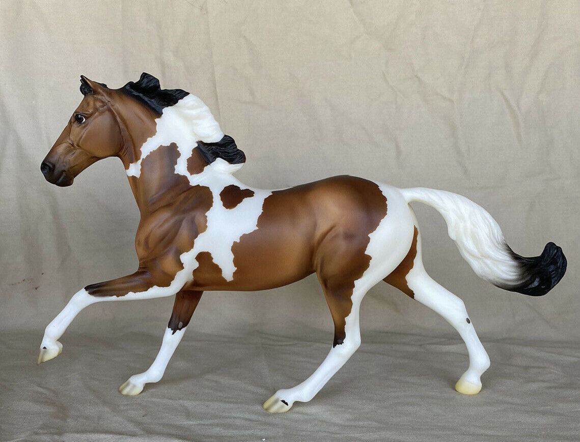 Matte bay pinto; large star; snip; 4 stockings; striped hooves; BreyerFest SR; 1/364