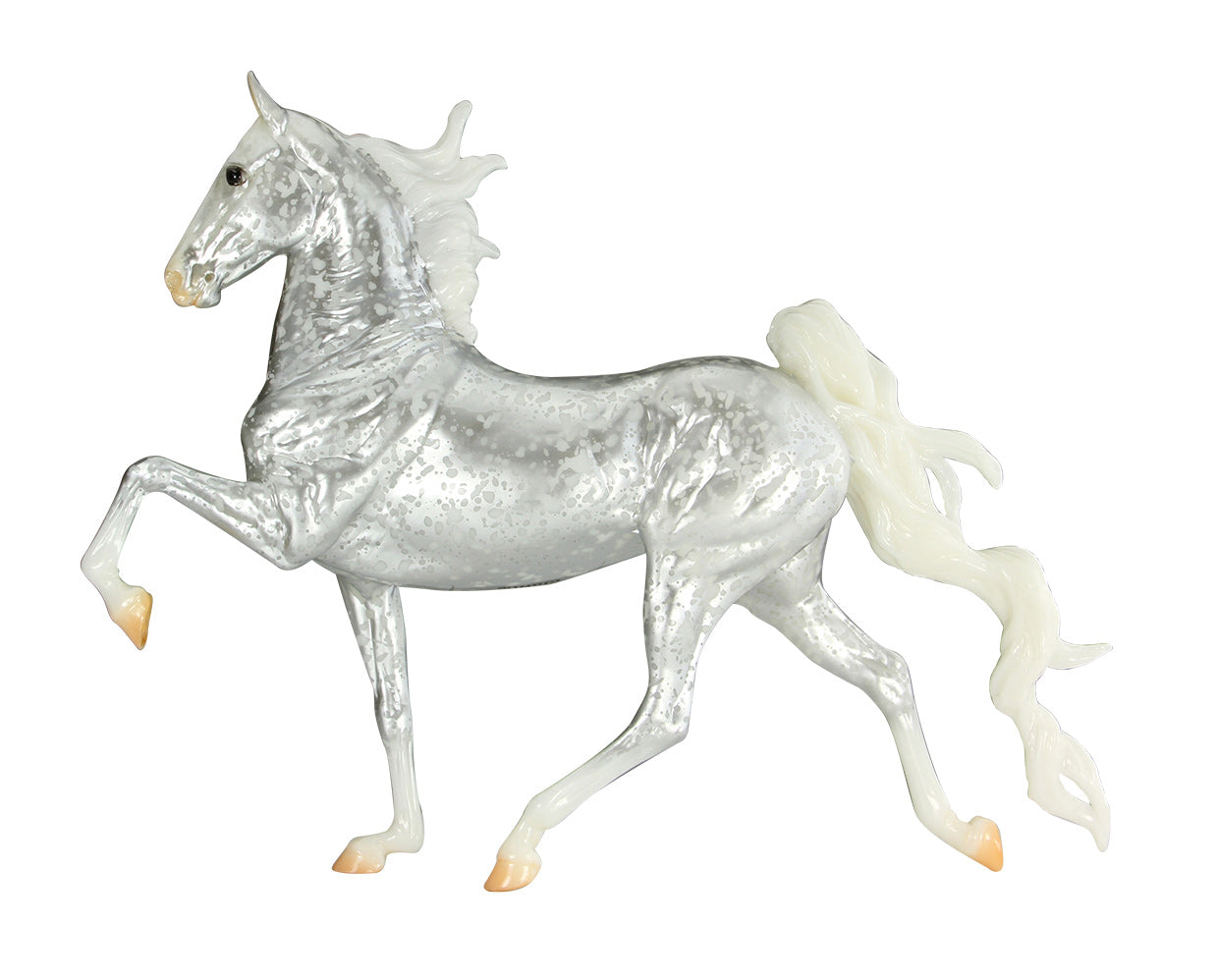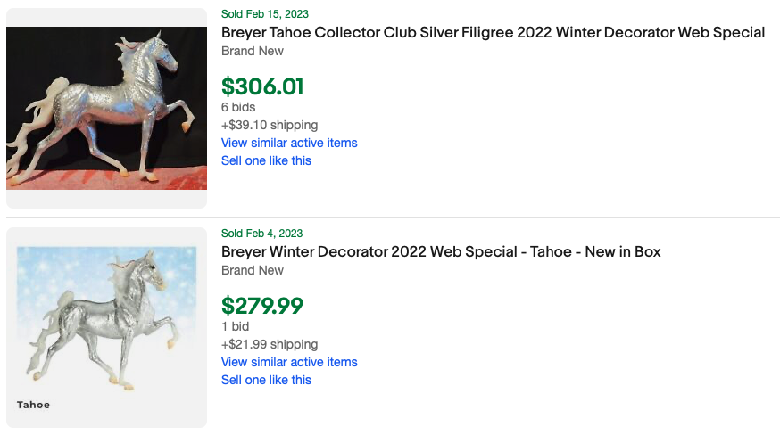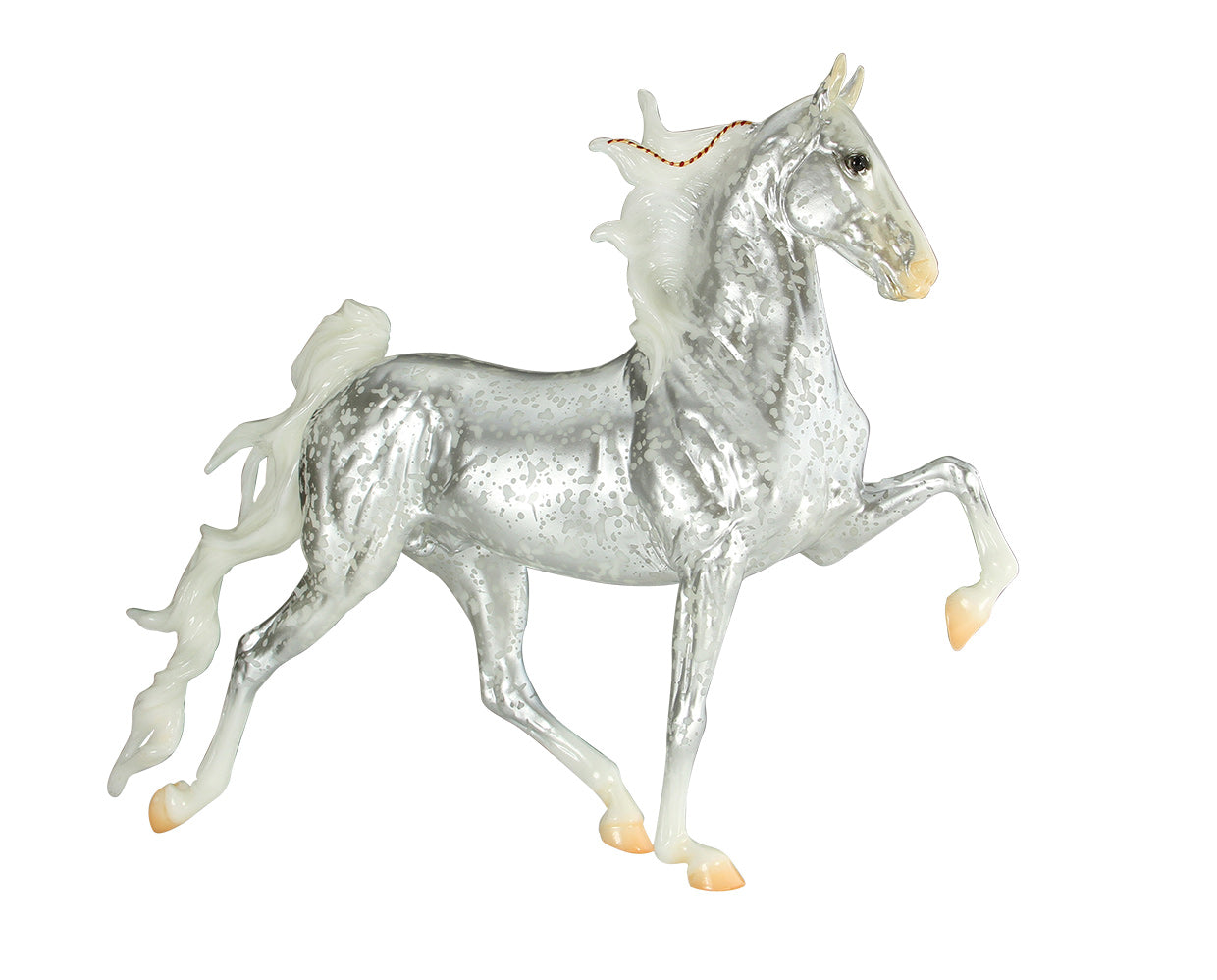 Glossy silver filigree, white mane and tail, gold and red ribbons, 4 socks, tan hooves, “Tahoe 2022” belly stamp, Winter Decorator Web SR, 1/1000 Issue price: $195