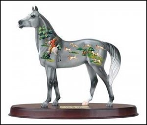 Glossy grey porcelain with hunt scene decals; on wood base; Breyer Gallery SR
