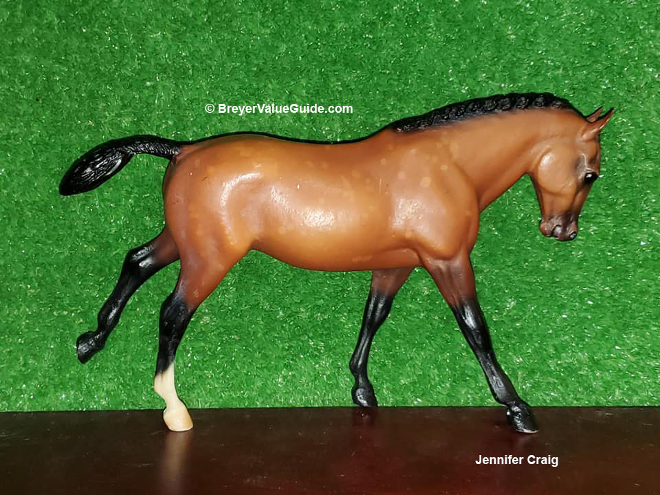 Matte bay; large resist dapples; large star; 1 hind sock; no mane ribbons