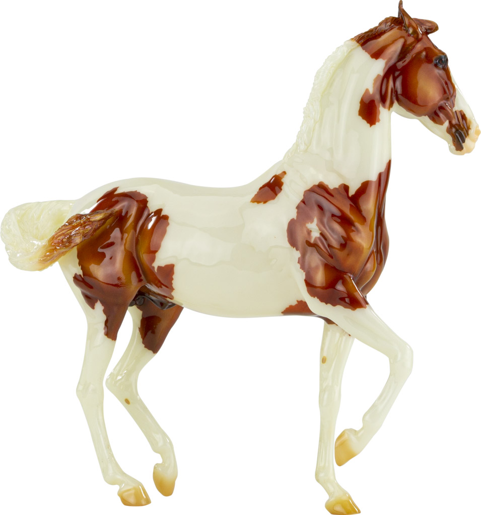 Glossy bright chestnut pinto, wide blaze over muzzle, Marwari curled ears, white legs, bi-color mane and tail, BreyerFest SR, 1/1000 Marwari version