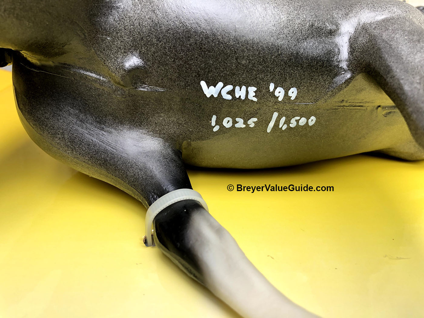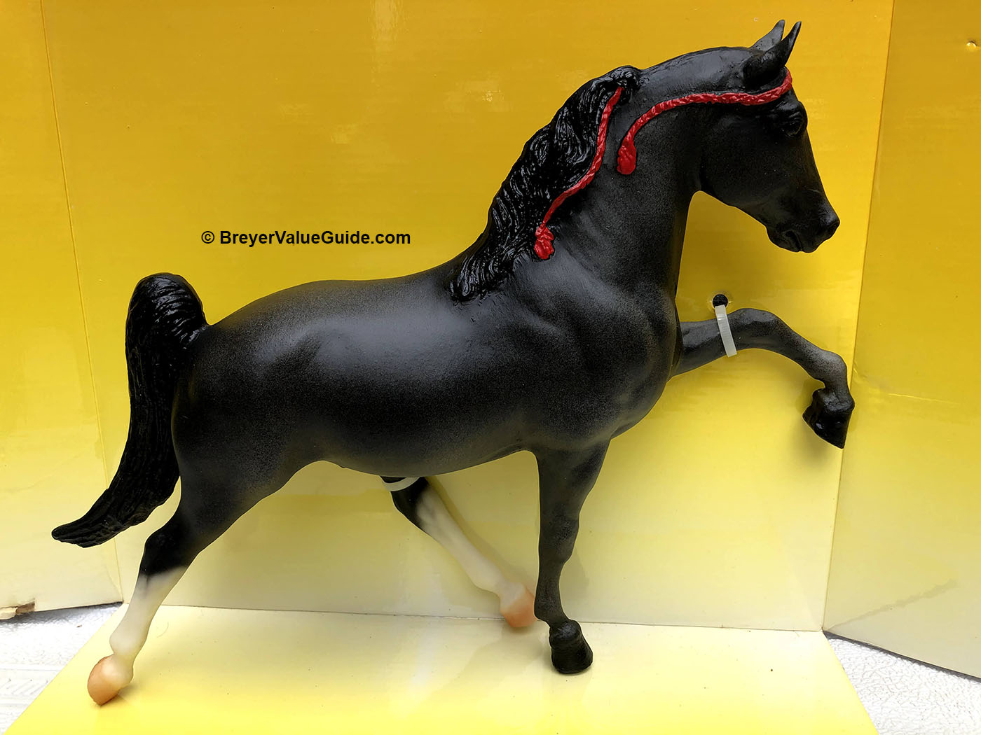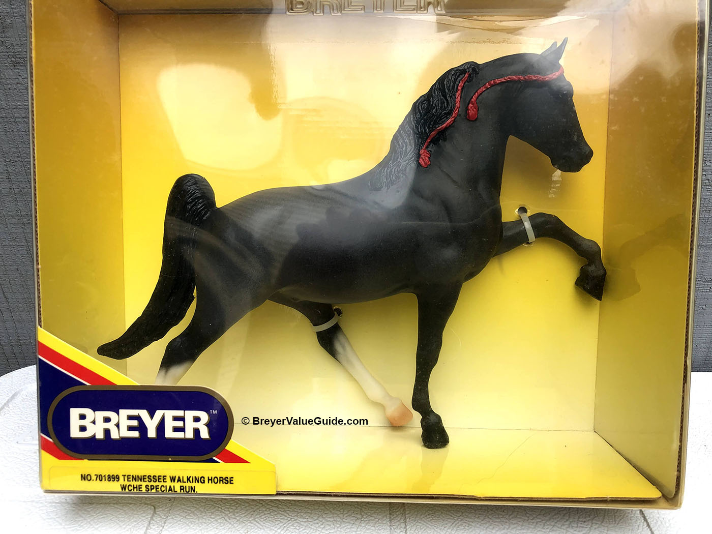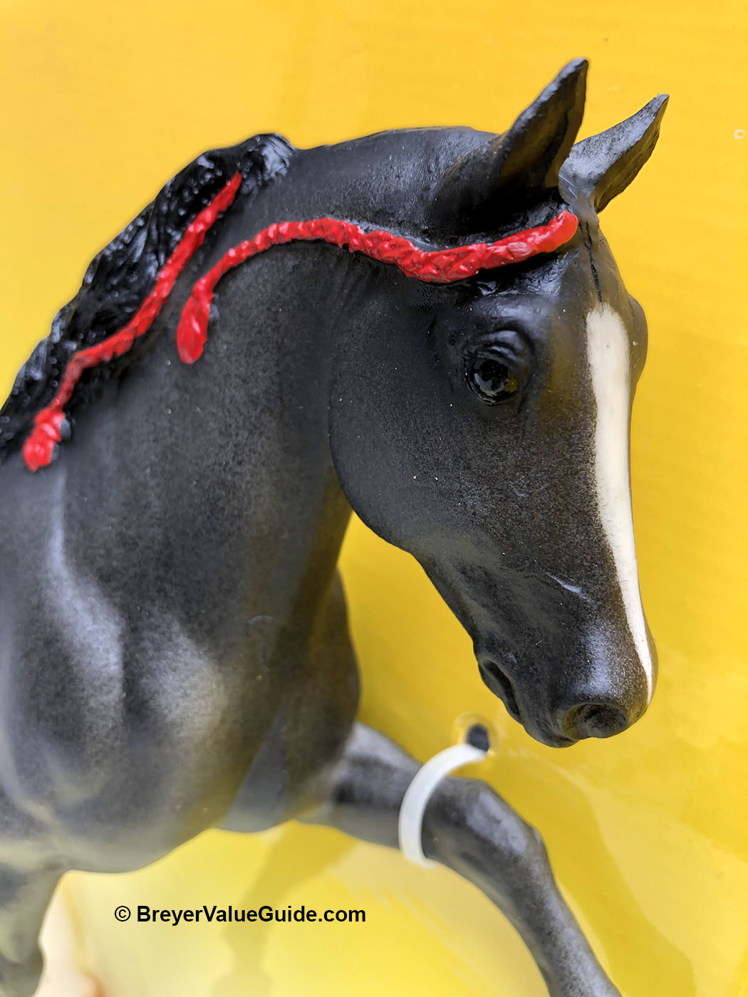 Matte blue roan; blaze; 2 hind stockings; red ribbons; “WCHE” and number written on belly; World Champion Horse Equipment SR; 1/1500