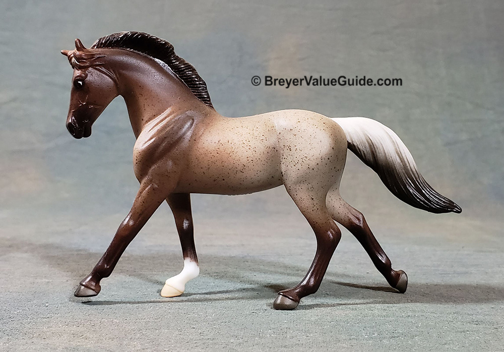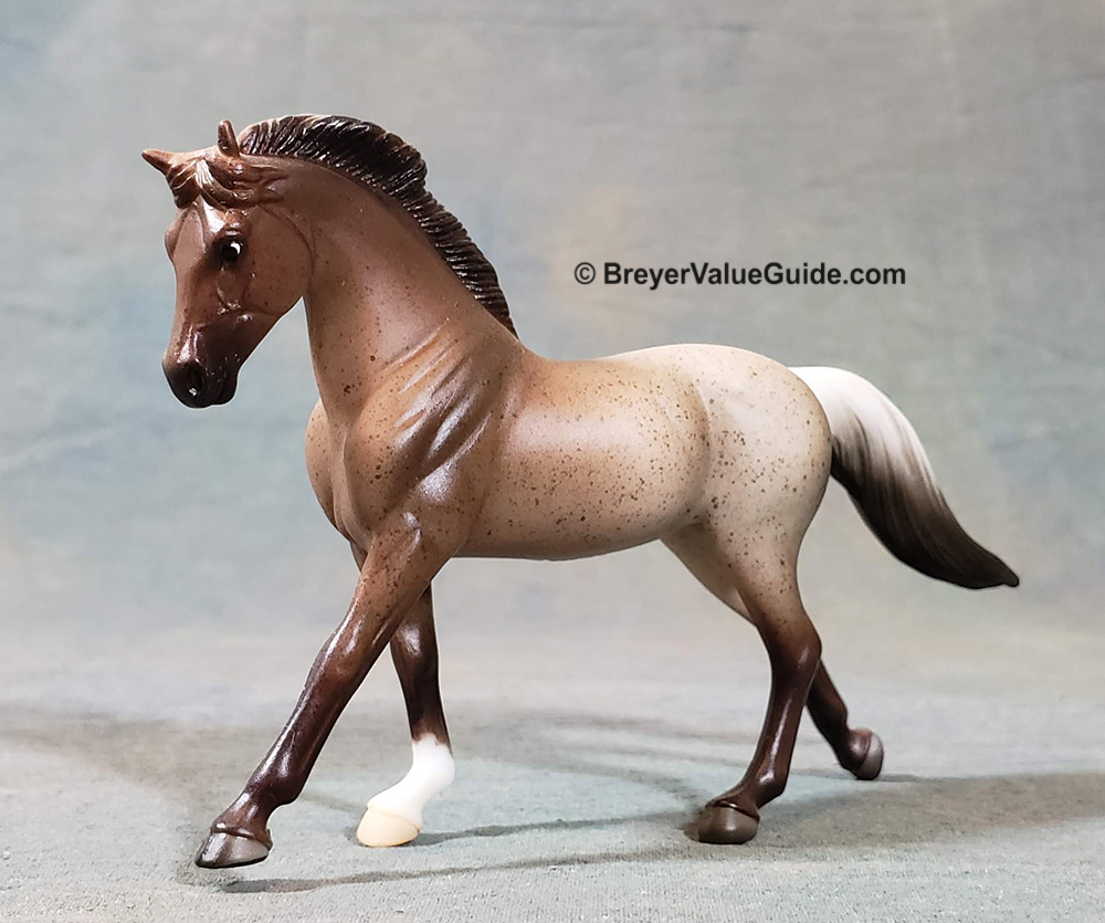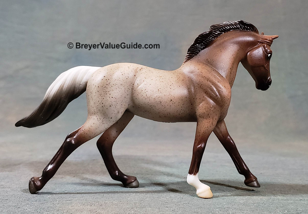 Matte brown bay roan; solid face; shaded tail white to black; 1 front sock