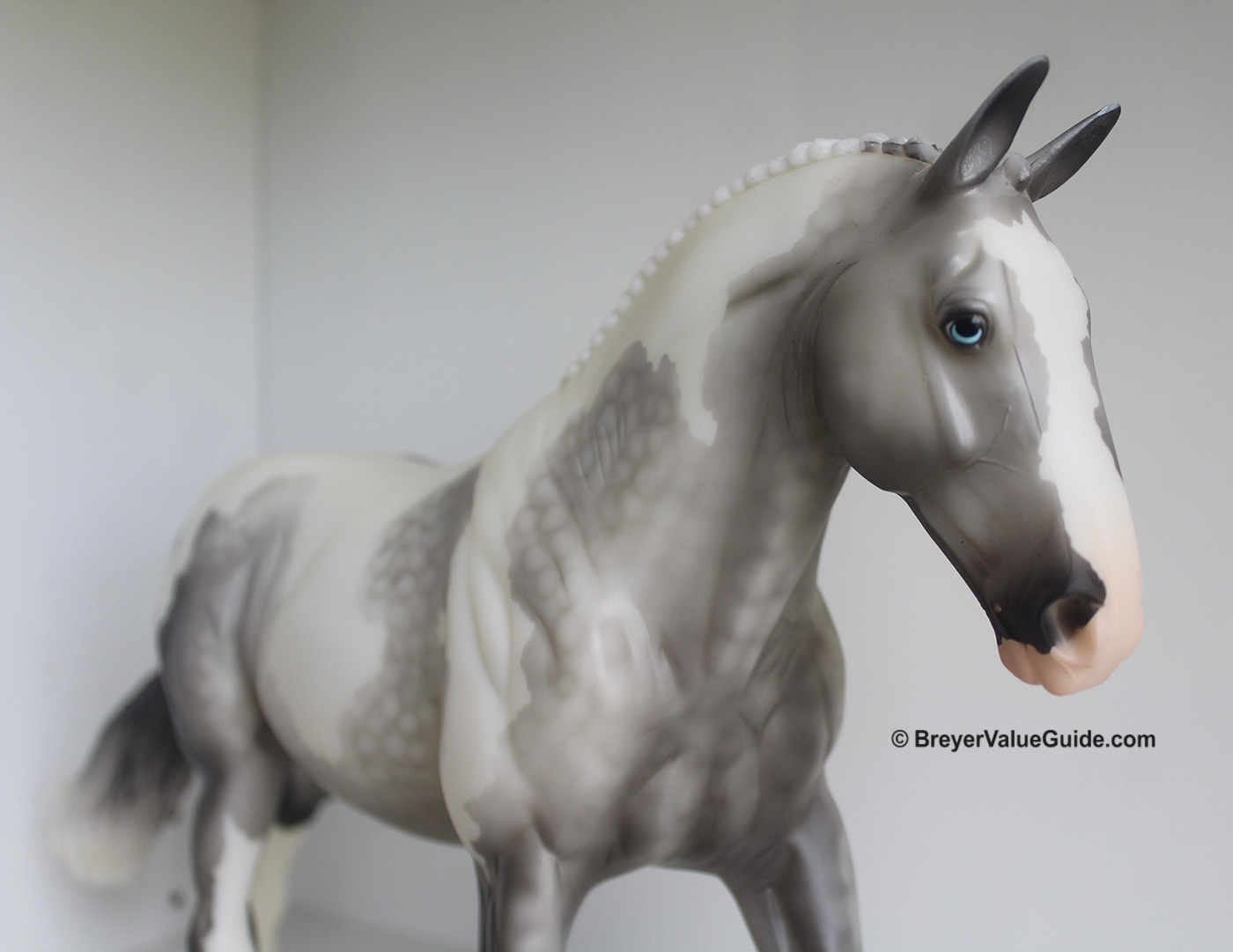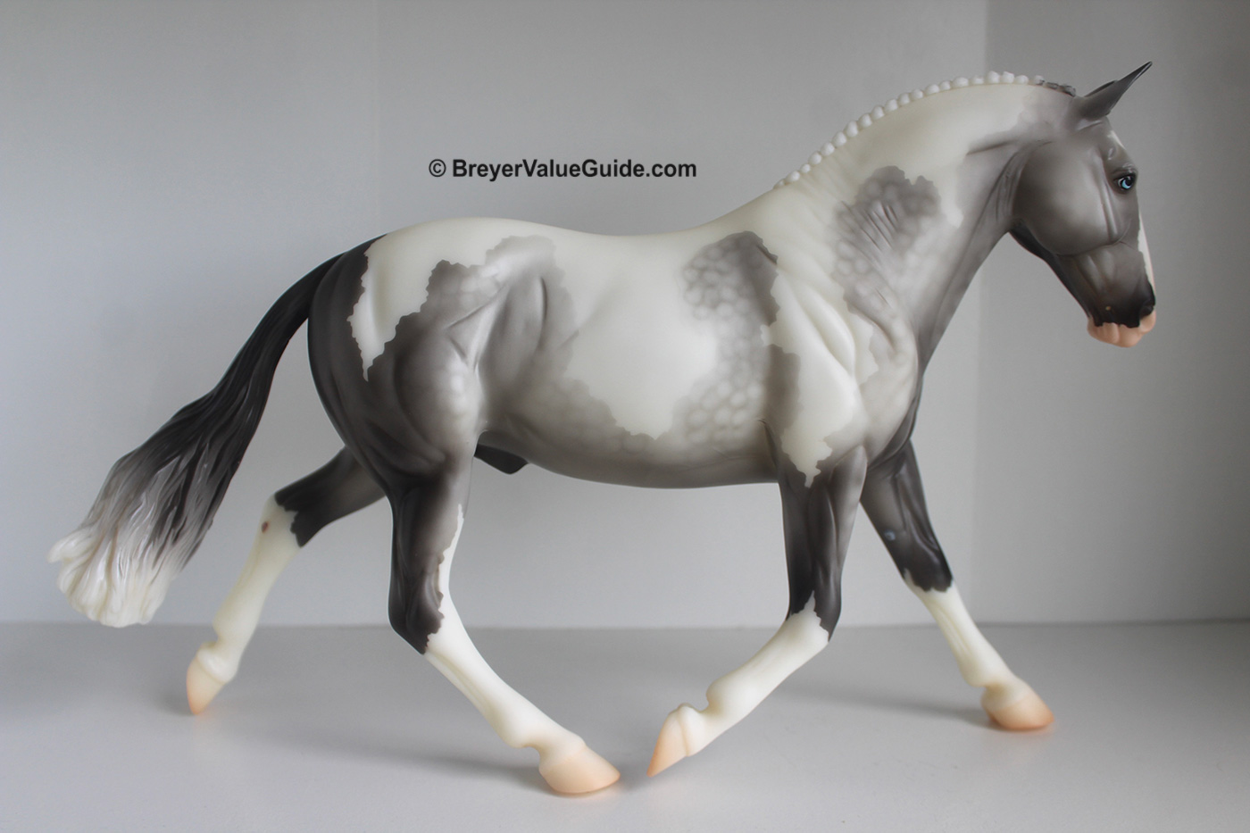Matte grey pinto, dapples, 1 blue eye, wide blaze, 4 stockings, braided mane, BreyerFest SR, 1/1110 matte