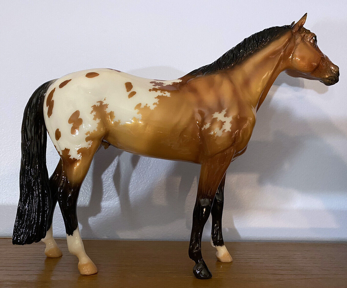 Glossy metallic buckskin appaloosa; mottled nose; blaze; 3 socks; BreyerFest SR; 1/1500 split between glossy and matte finish