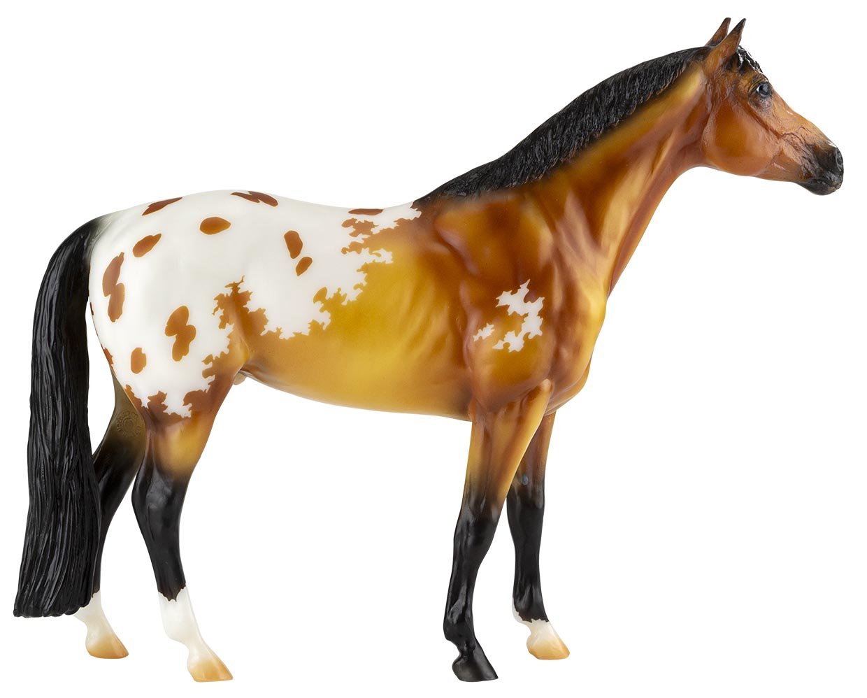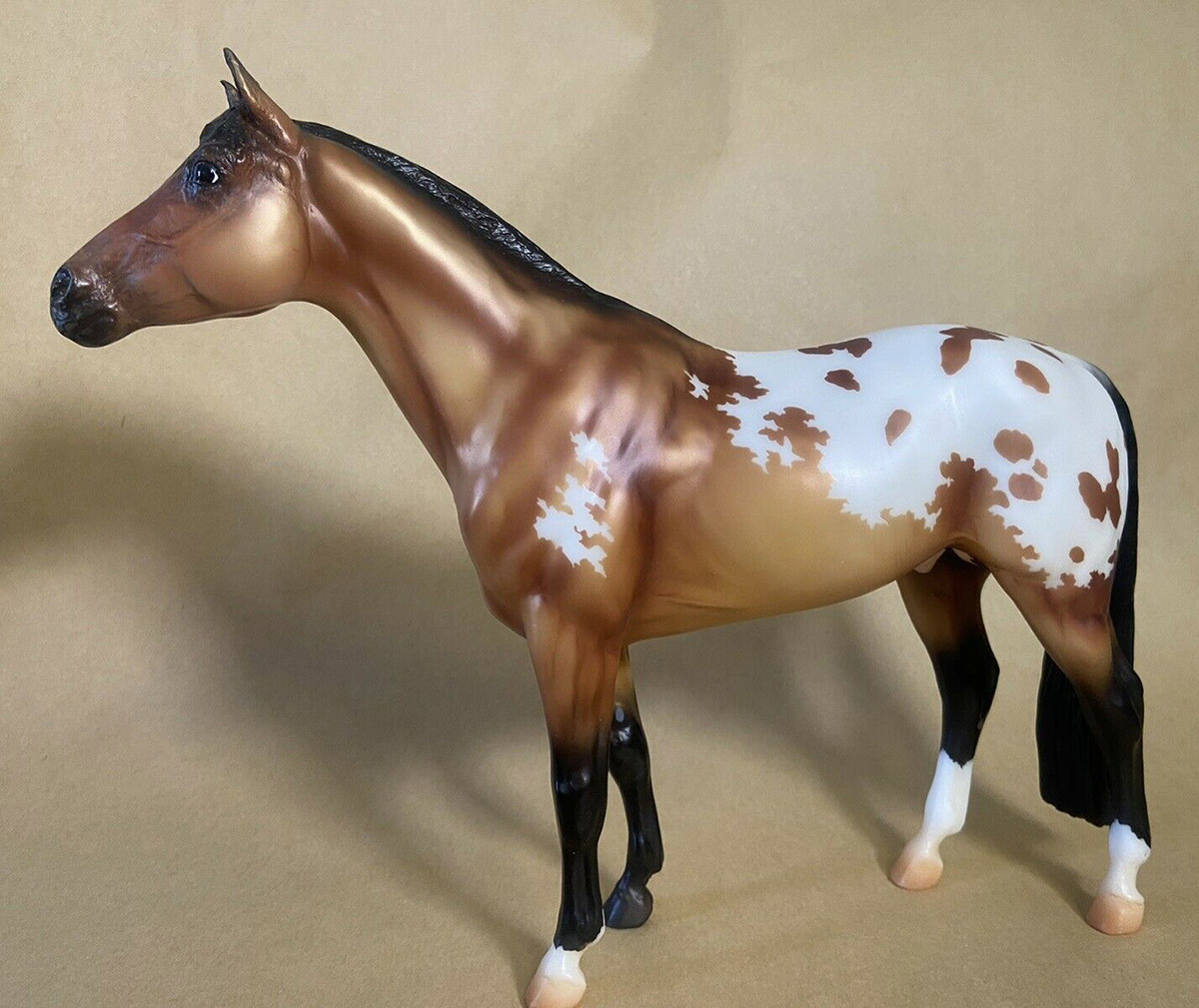 Matte metallic buckskin appaloosa; mottled nose; blaze; 3 socks; BreyerFest SR; 1/1500 split between glossy and matte finish