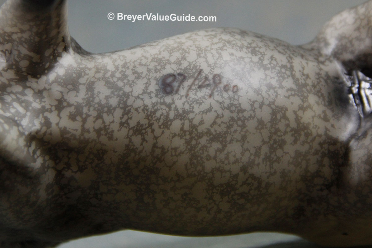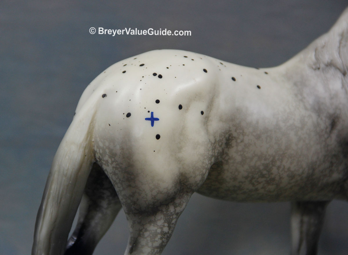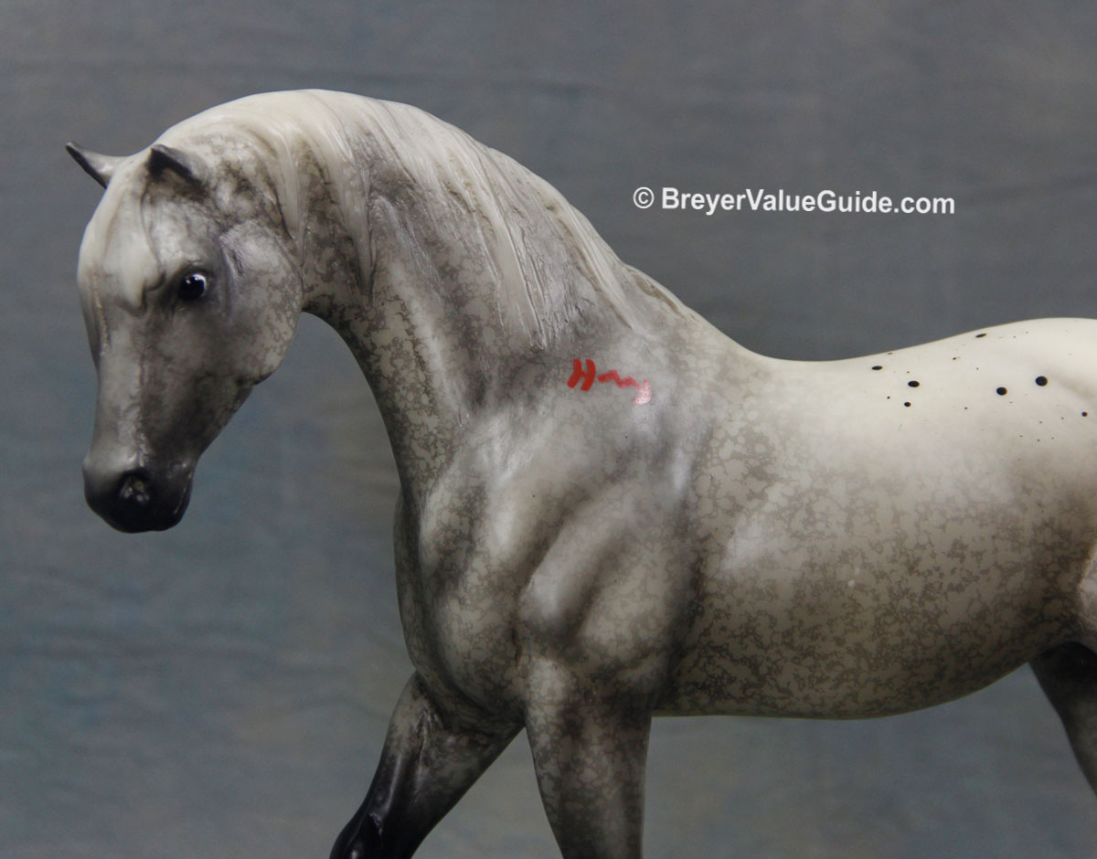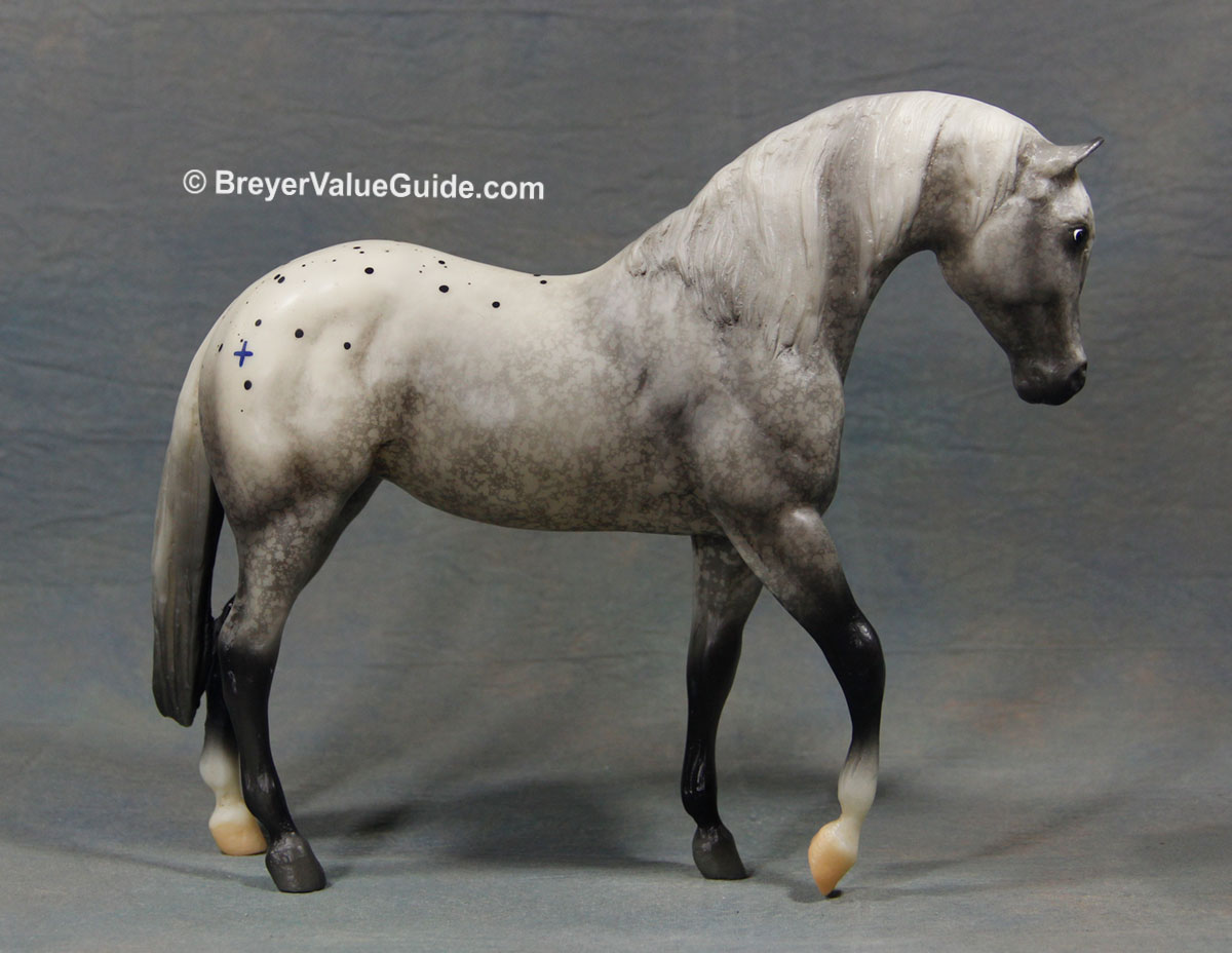 Matte light dapple grey appaloosa; resist dapples, black splash spots; 2 socks, red arrow on shoulder, blue cross on hip, hand numbered on belly, 1/2900