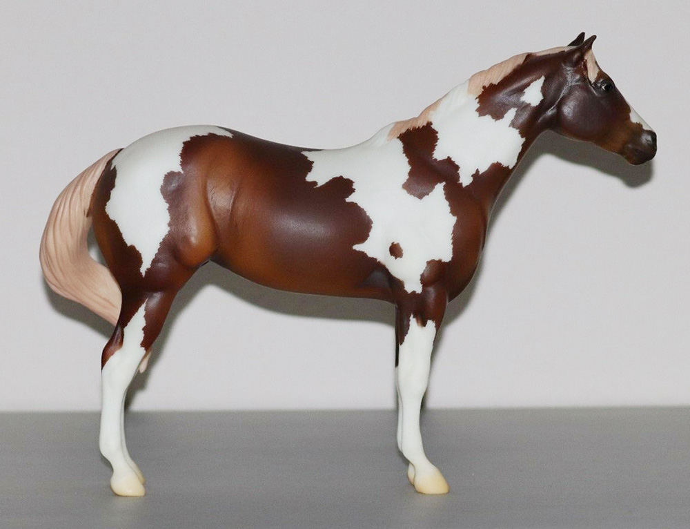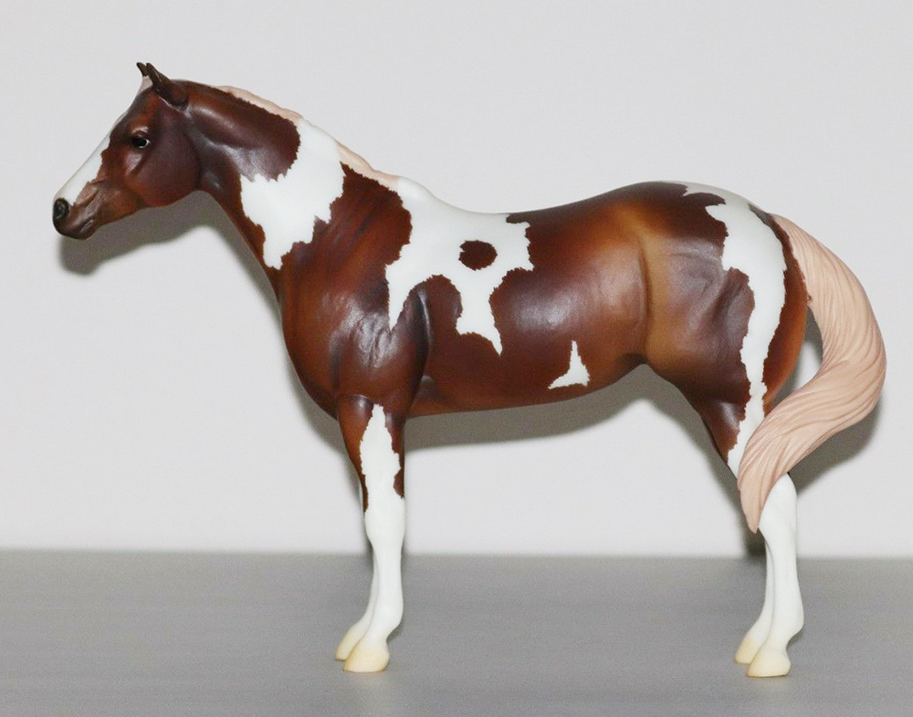 Matte sorrel pinto; wide blaze; 4 stockings; swish tail version