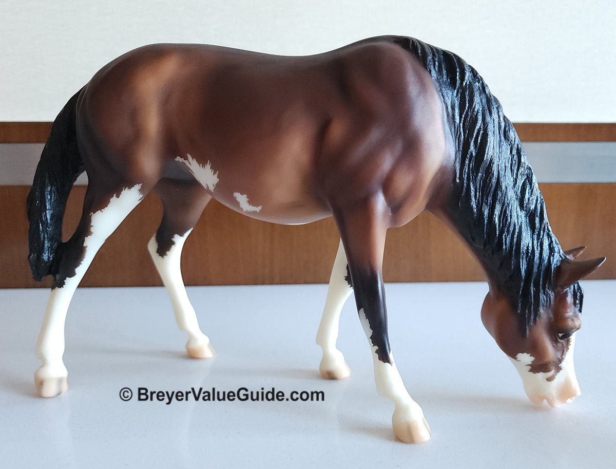 Mare – Matte bay pinto, stenciled bald face, 4 high whites, striped hooves