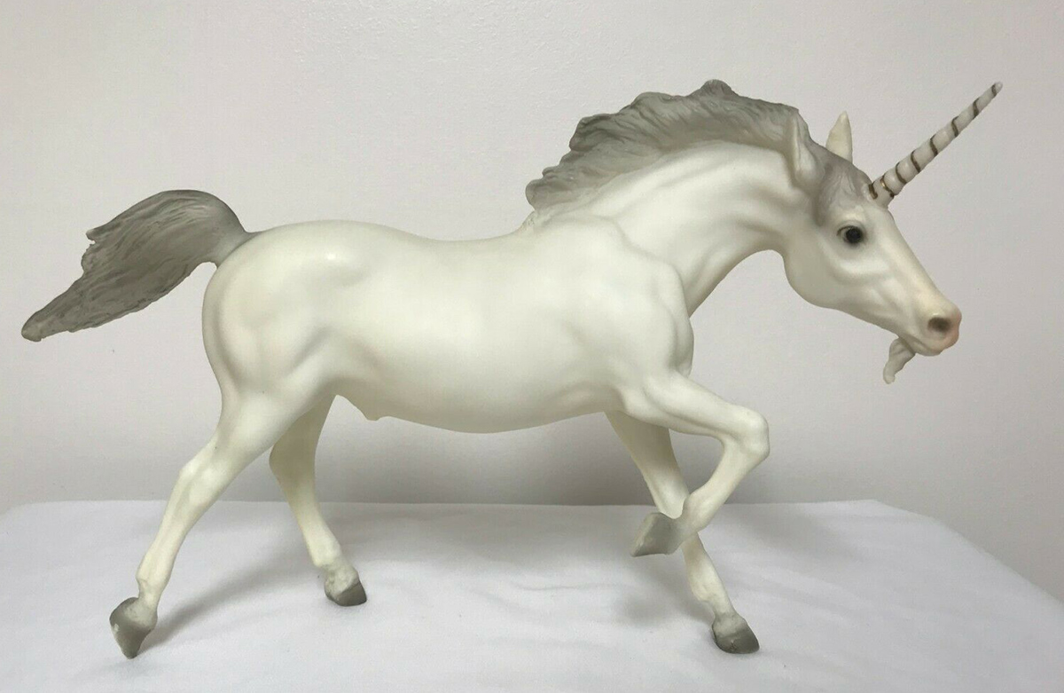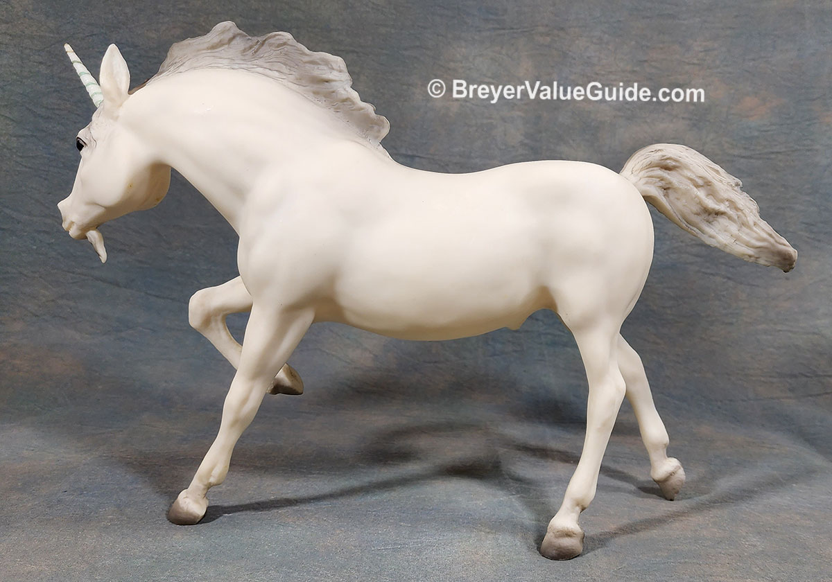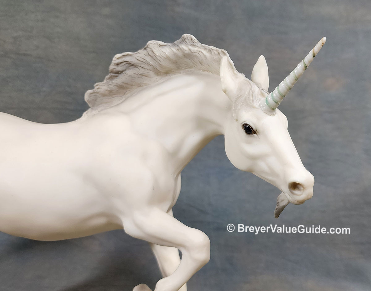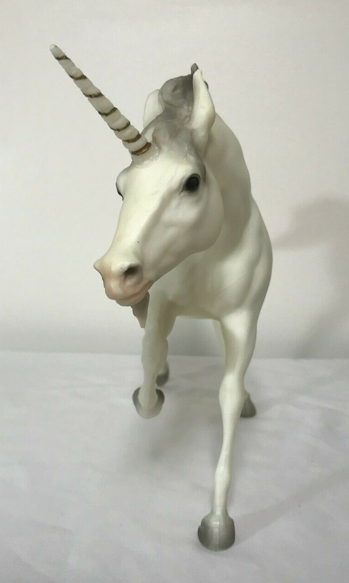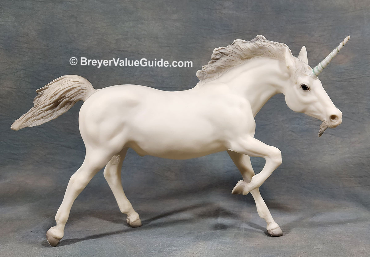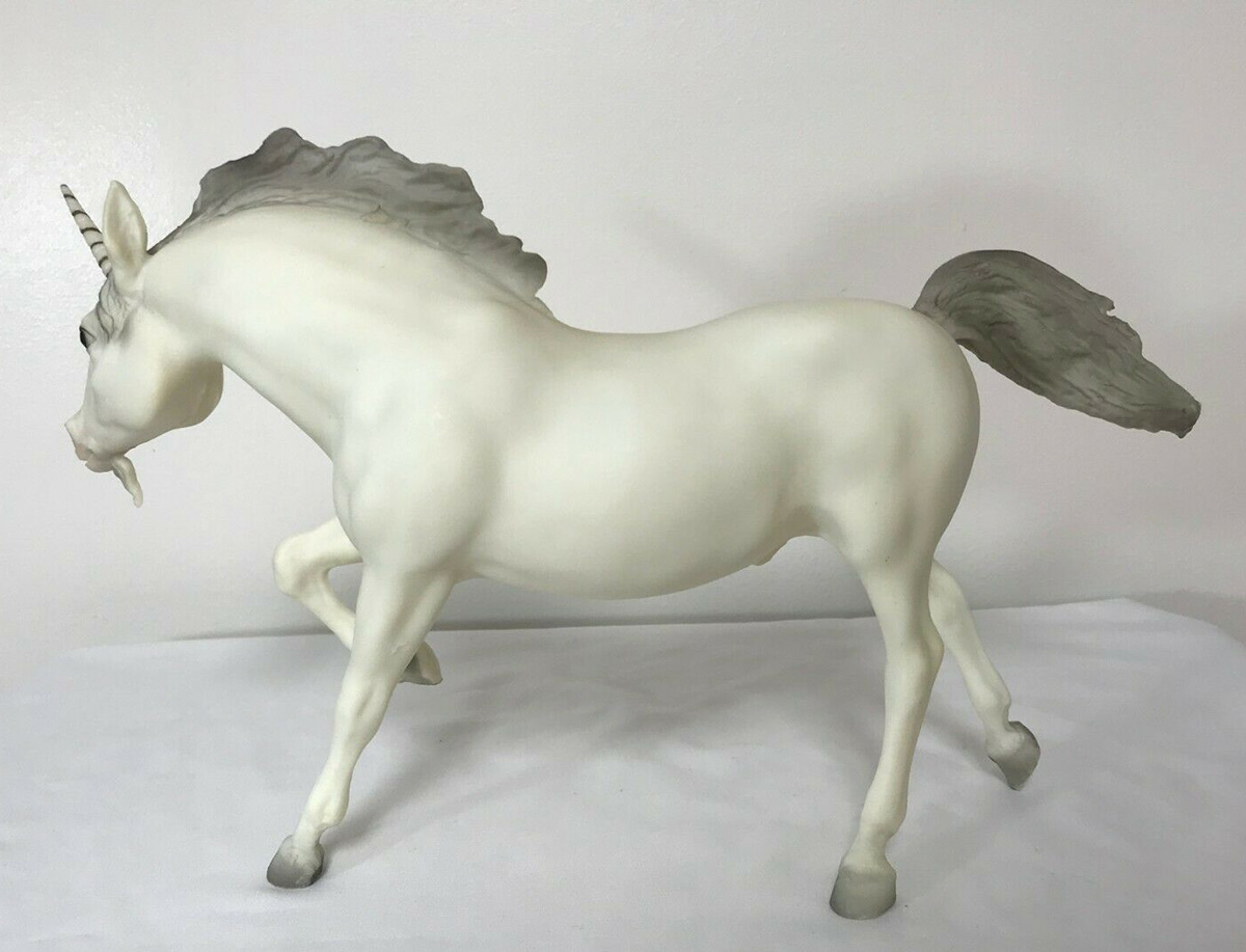 Matte alabaster; grey mane and tail; added beard; gold striped horn