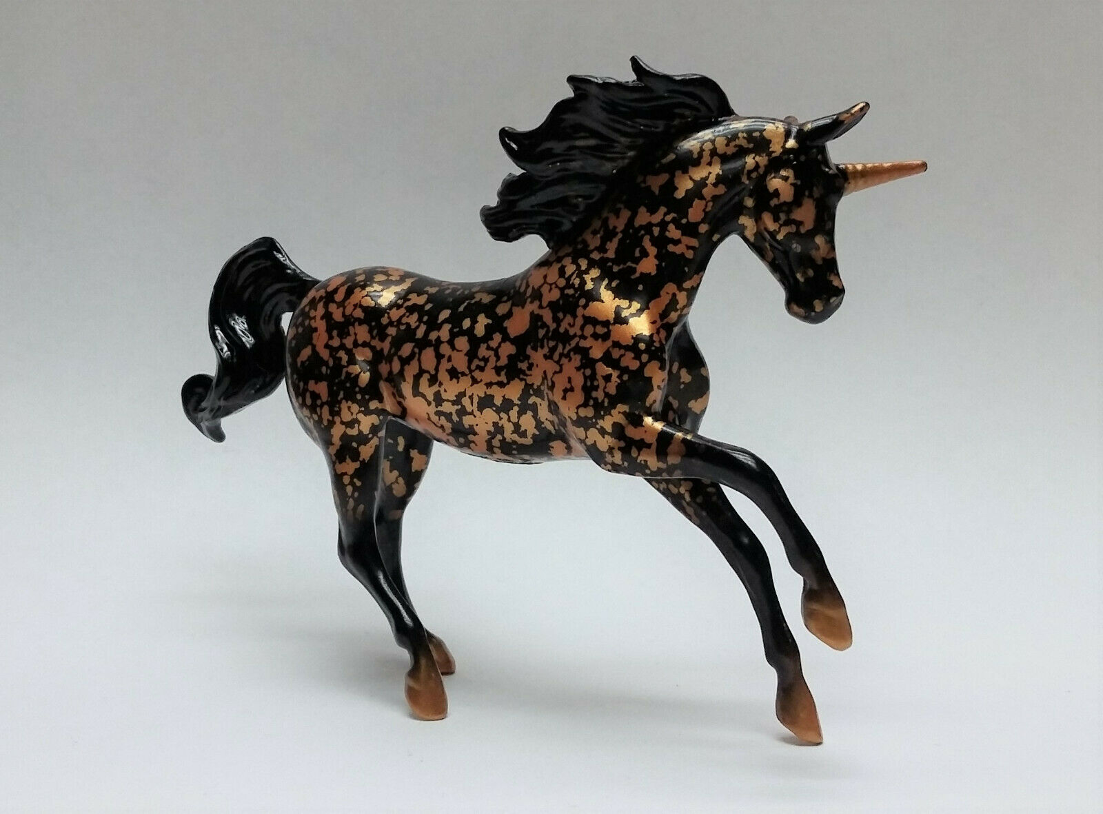 Glossy black with orange resist dappling, gold hooves and horn, “chase” piece