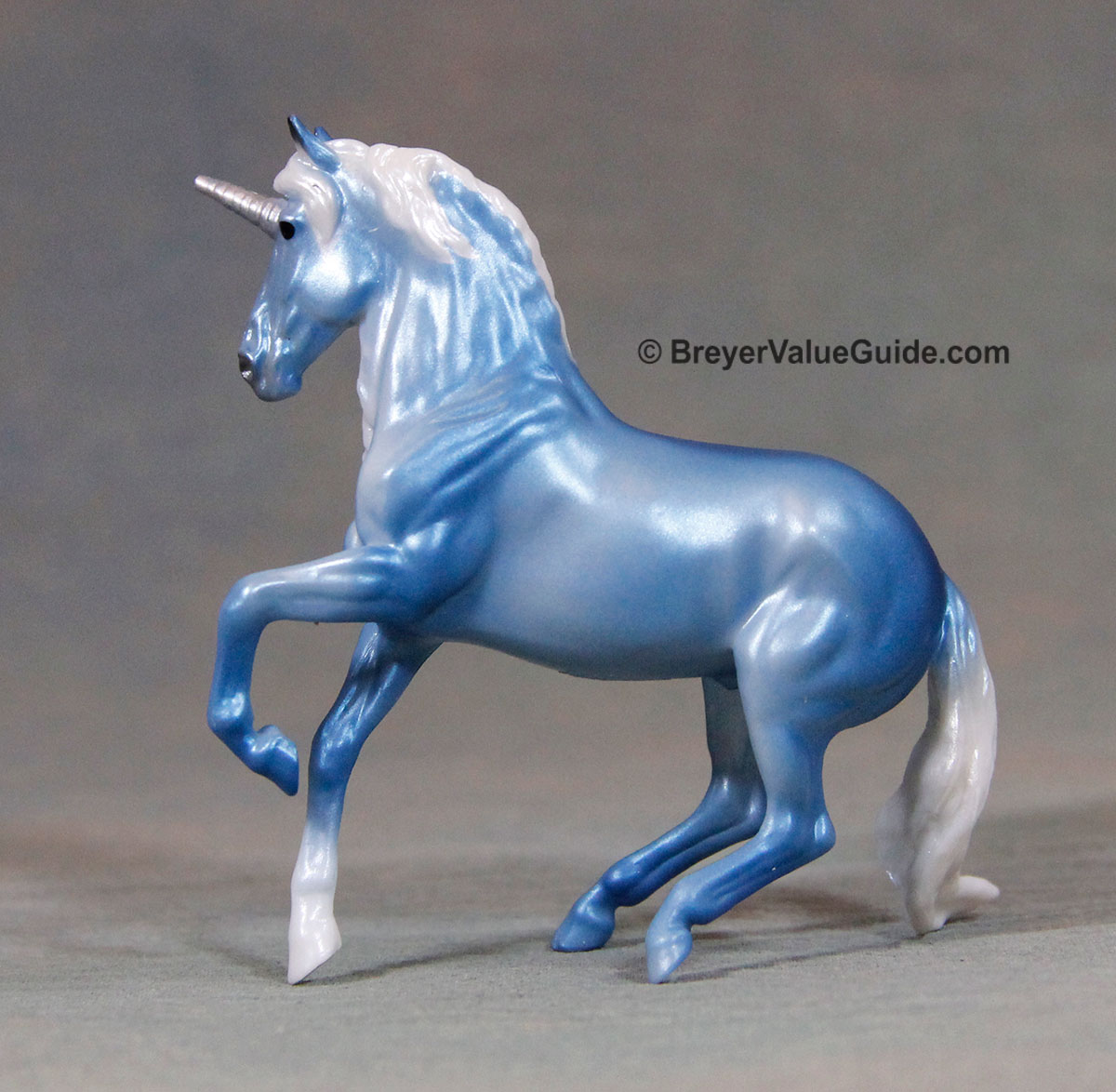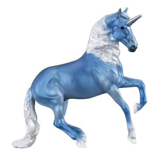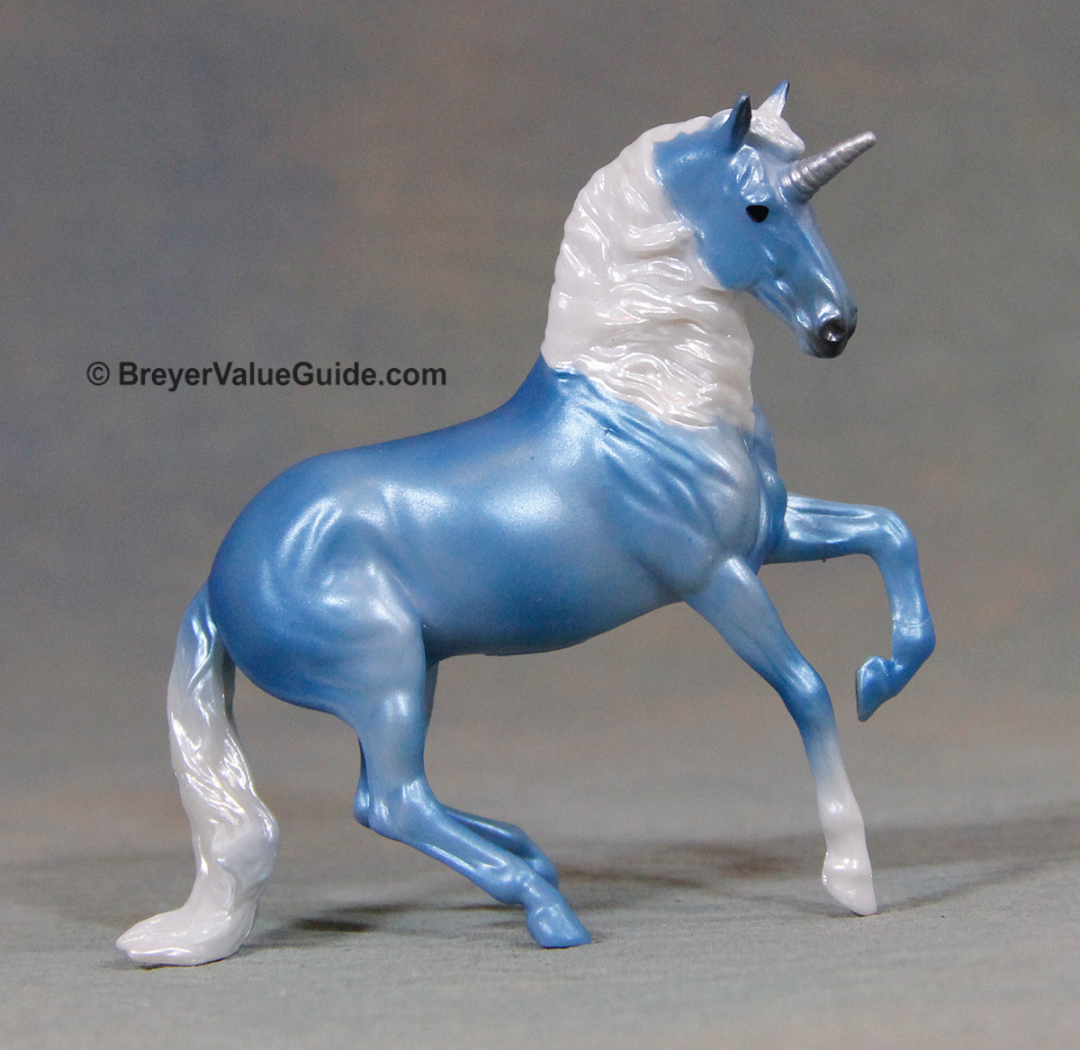 Iridescent blue with white mane and tail; 1 front sock; silver horn – with Magnolia and Frisky Foal